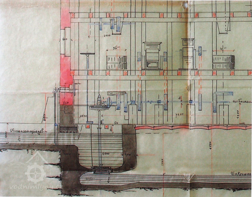 Popis1901: Girardova turbína s vertikálním hřídelem, na spádu 2,4 m při průtoku 220 l/sec dosahující výkonu 5,6 HP (max. možný průtok 350 l/sec)