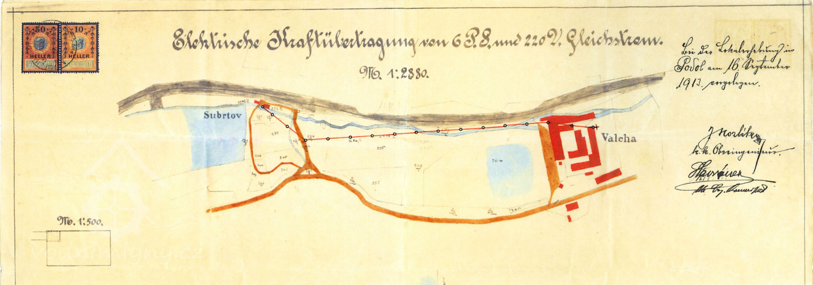 vyrobená elektrická energie vedena 600 m dlouhým venkovním vedení do závodu na Valše k osvětlení papírny