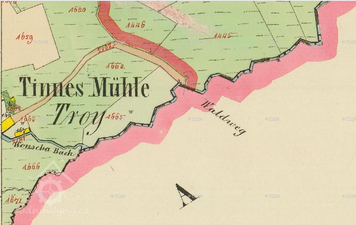 TINNESMÜHLE s pilou byl veden pod obcí Háj s čp. 23. V době když patřil pod Jedlovou, měl čp. 22. Nacházel se v nadmořské výšce 620 m. V jeho těsné blízkosti stál Strickerův mlýn, ( Jedlová čp. 23), který s Tinnesovým mlýnem splynul. J. Sommer ho roku 1847 uvádí jako Tinnesmühle na potoce Wonša u vsi Grafengrün. Mlýn měl jedno kolo na svrchní vodu, průtok vody 4,80 m3 /min., spád 350 cm. výkon 2,4 KS. Posledním předválečným majitelem byl Johann Konhäuser, za II. světové války vlastnila mlýn Julie Glasová. Po roce 1940 mlýn vyhořel a již nebyl obnoven.