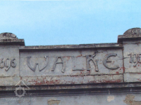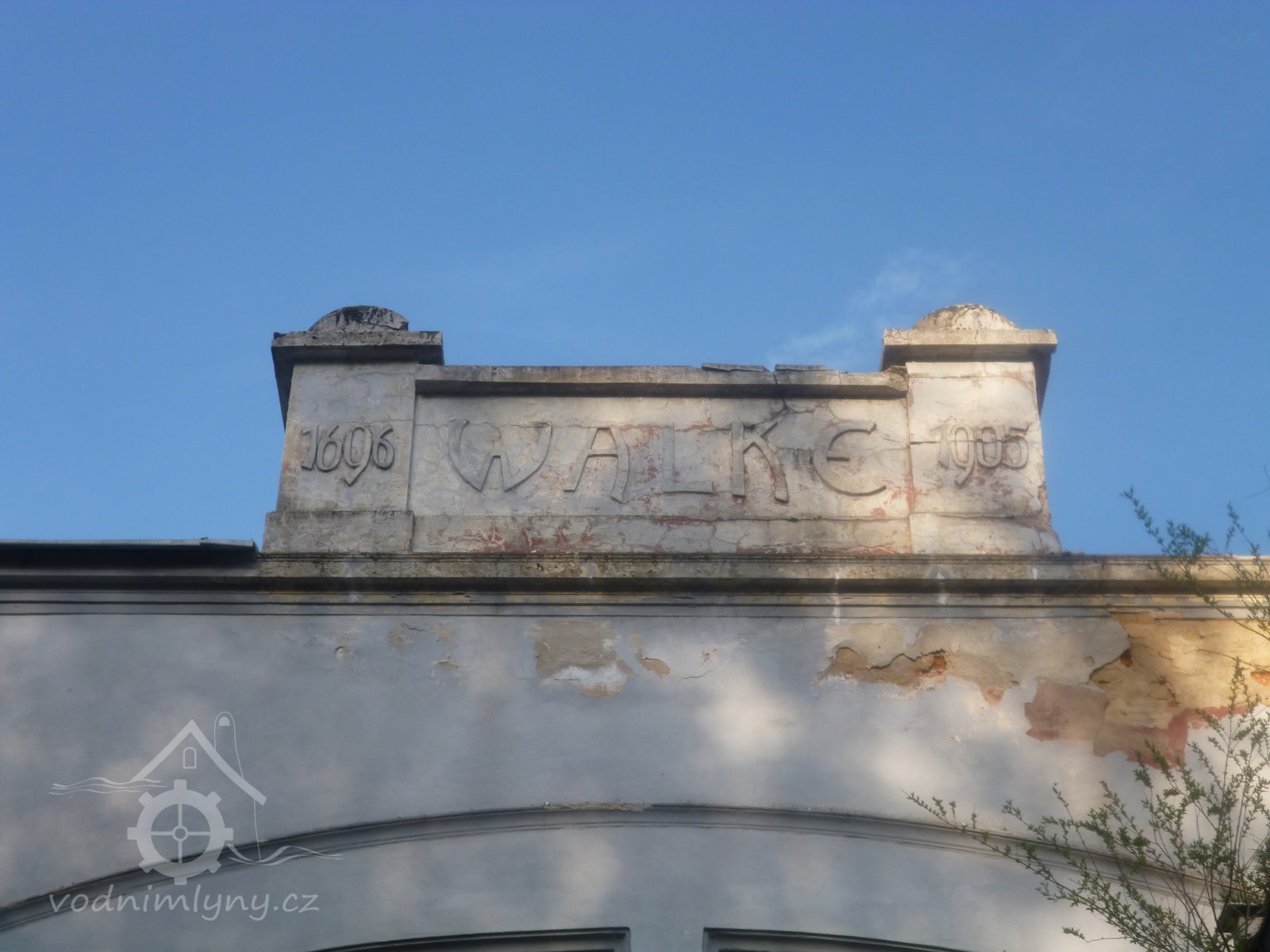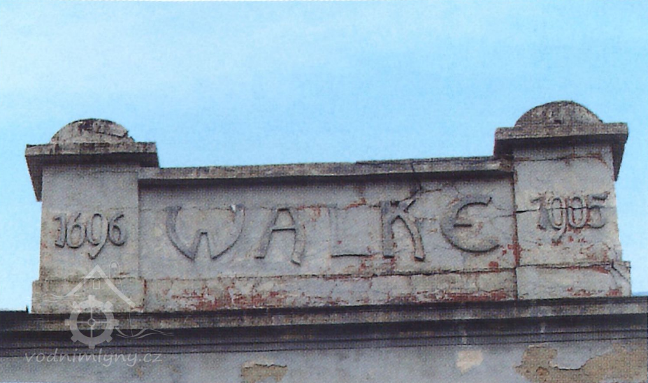 Na štítě papírny je v omítce nápis: Walke a letopočty: