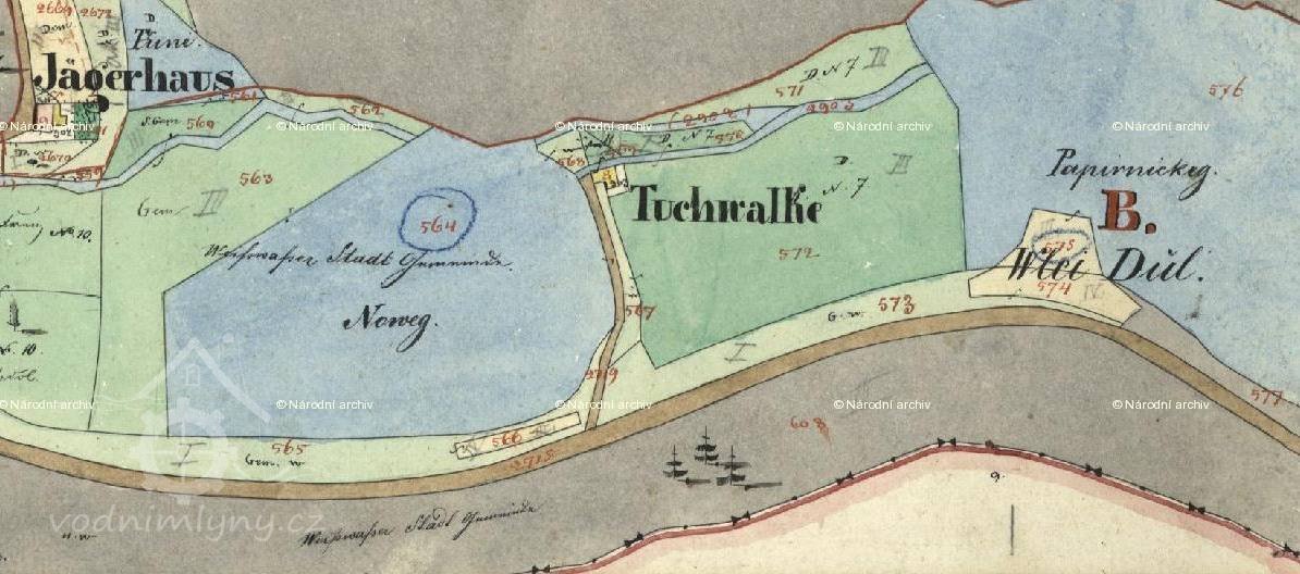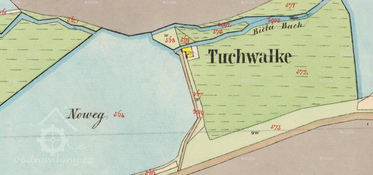 Podle indikační skicy odpovídá č.d. 8 (bývalému) mlýnu na ind. skice označeném jako "TUCHWALKE", a to v místě, kde později