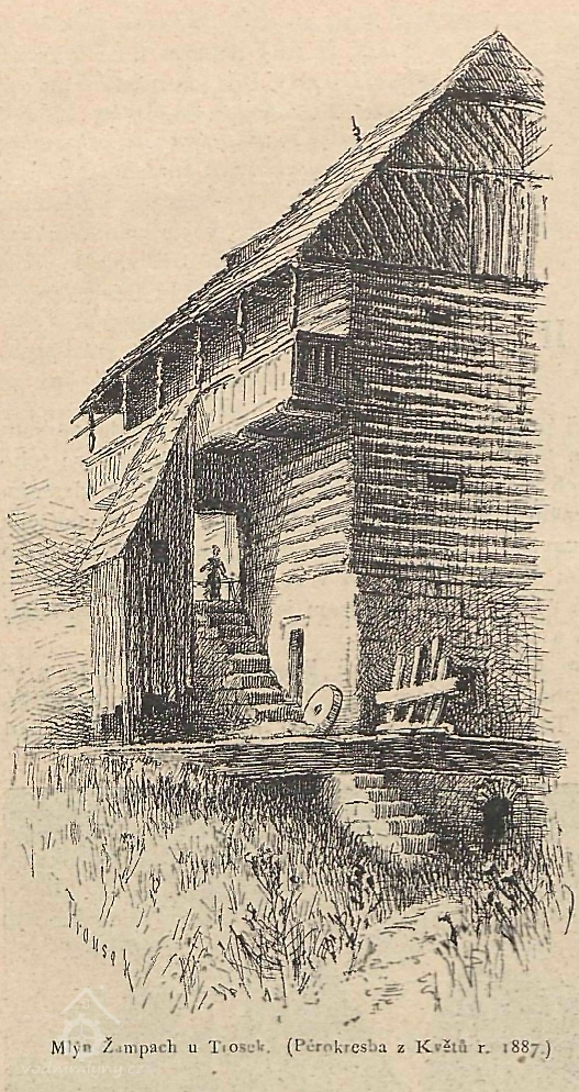 Poslední mlynářka v Žampachu byla pí. Náhlovská, podle které se ve mlýně vystřídalo 13 generací mlynářů - info: současný majitel mlýna p. Šperlink.