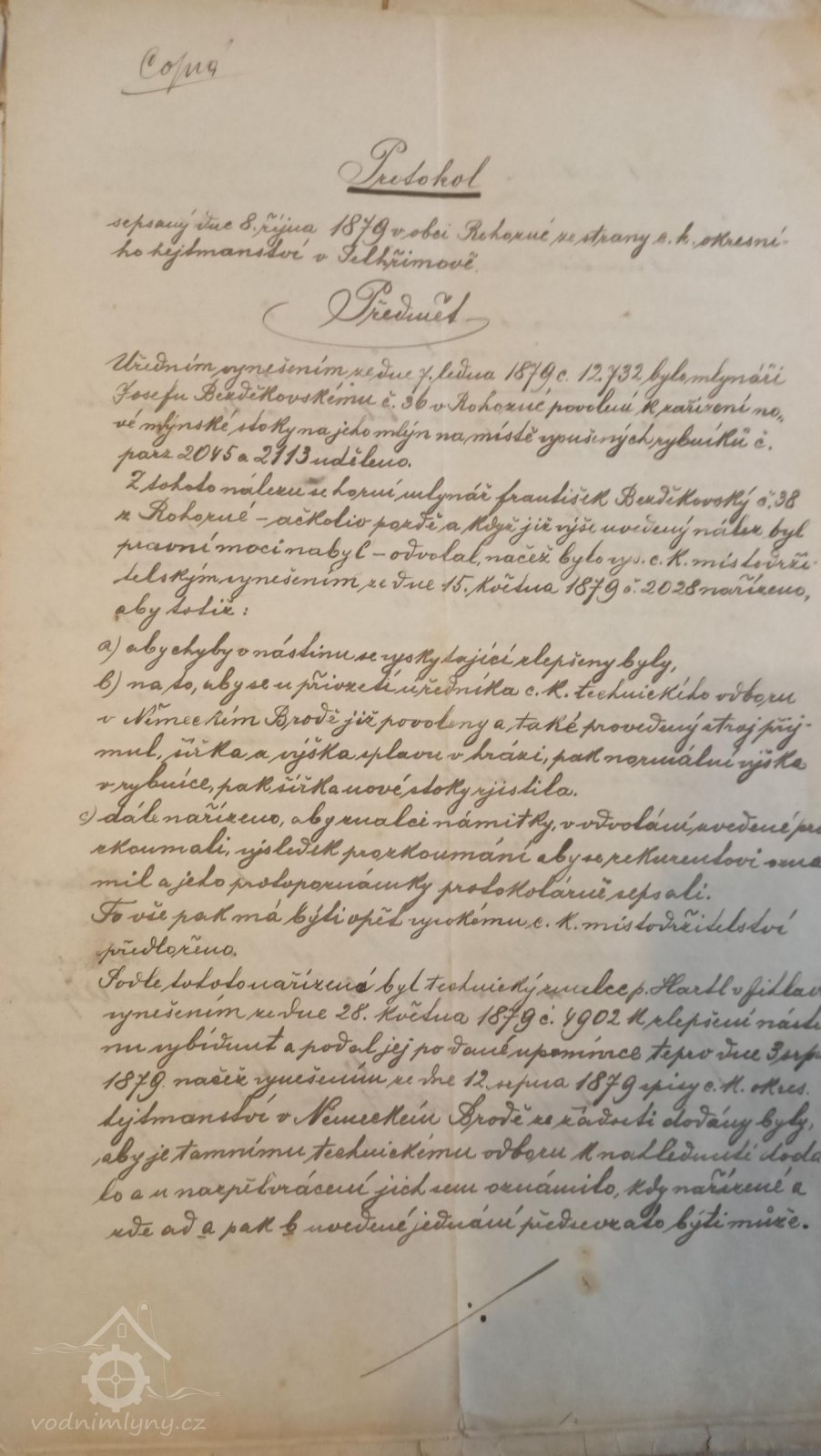 SokA Pelhřimov, Fond OÚ Pelhřimov, Bezděkovský mlýn, Rohozná čp.36, Vodní kniha I, příručka č112/2014, č.položky 112