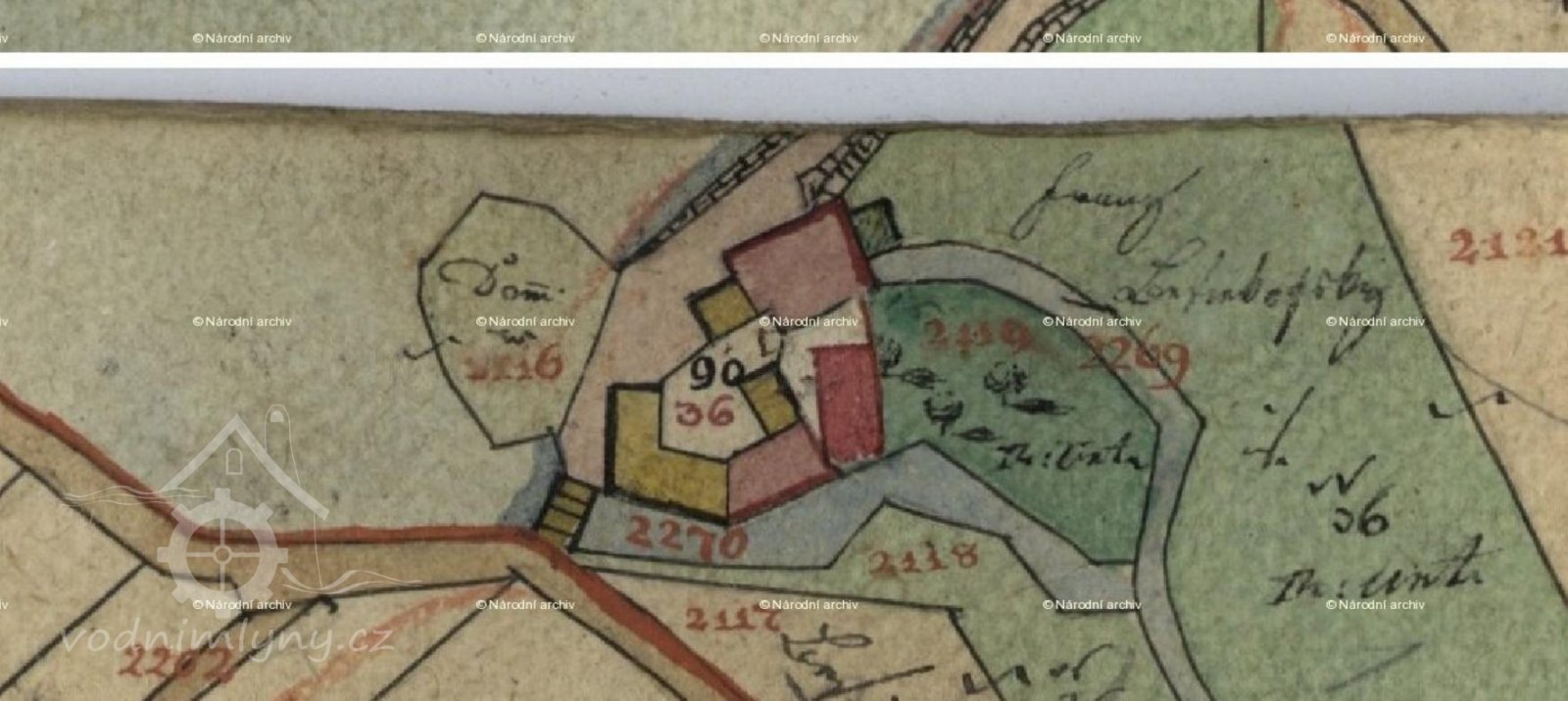 Odpadní voda od horní mlýna se pod mlýnem spojuje s jalovým potokem. Hned po spojení je v potoce jez, kterým se voda nahání do mlýnské strouhy ke mlýnu čp.36. V mlýnské strouze je pod mostem, který přes ní vede, jalový dřevěný splav s jedním stavidlem používaným při čištění strouhy. Strouha ústí do vantrok1,2 m širokých se dvěma stavítky. Stavítko k hornímu kolu je 45 cm široké, k dolnímu kolu 70 cm. Jez na potoce byl následkem sporů opatřen v r. 1884 provizorním normálním znamením.