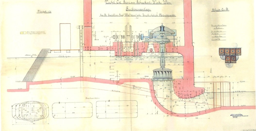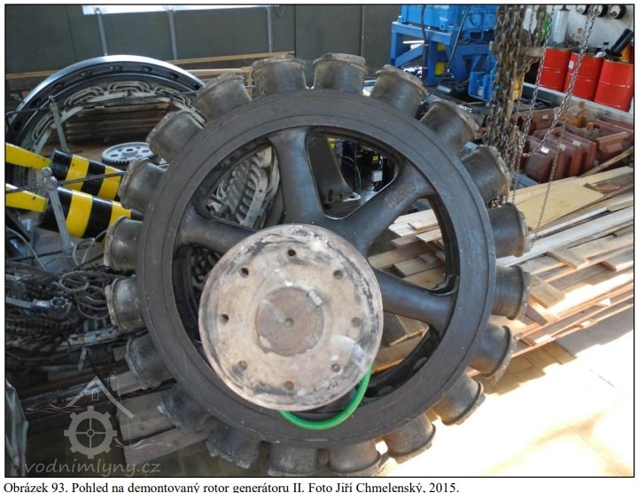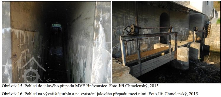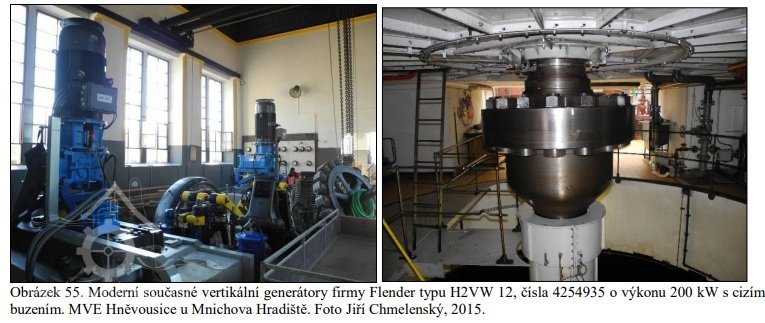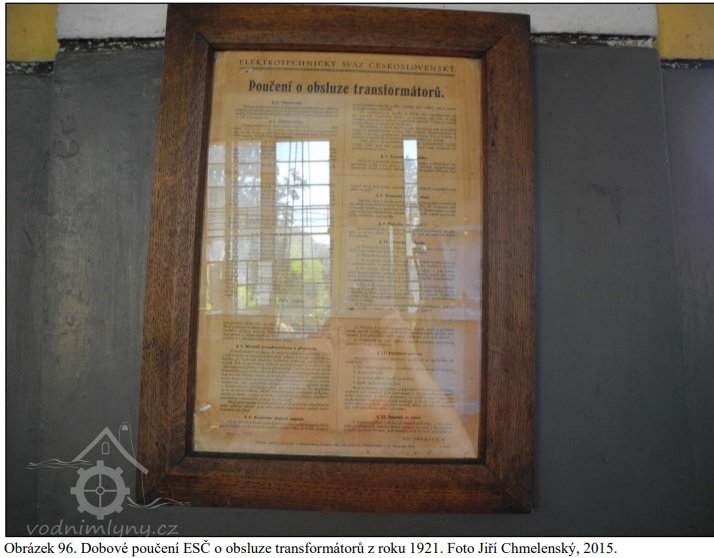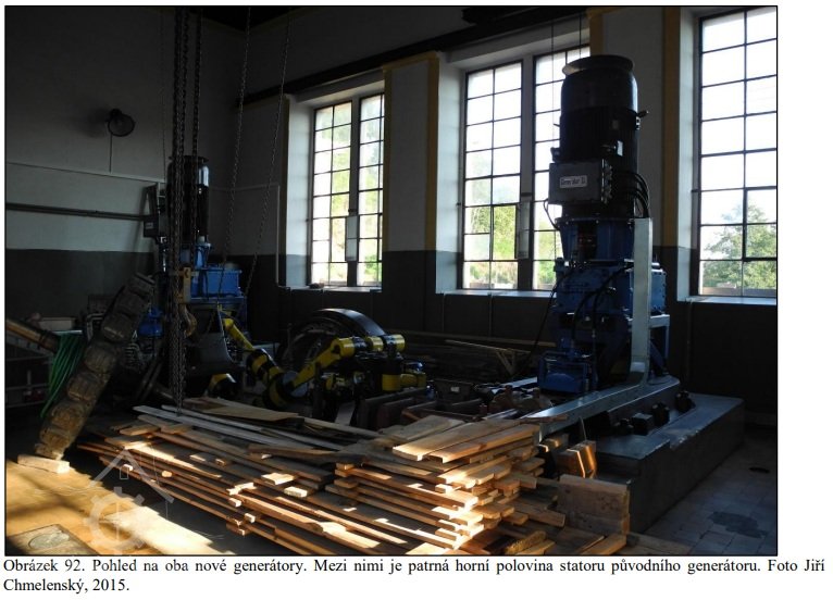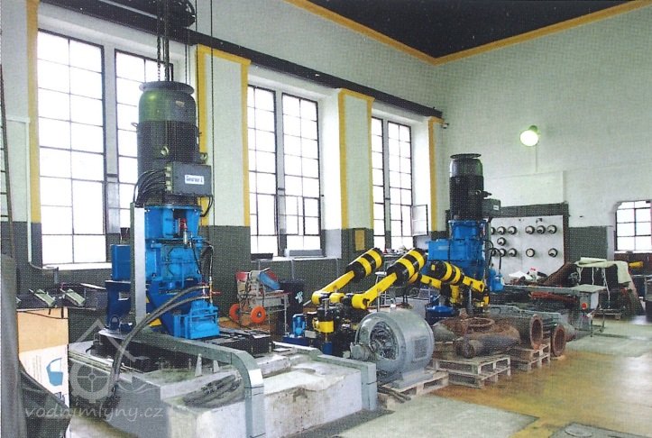 Popis1912: 2 vertikální Francisovy turbíny s kolenovou savkou o prům. 1.400 mm, hltnost 6 m3/s, spád 3,6 m, výkon 218 kW, 82,5 ot/min