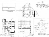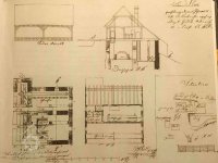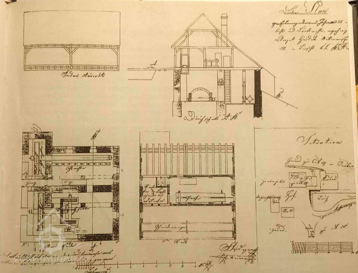 Na plánu pily z téhož roku vidíme schéma převodu od pilního kola. Hřídel s pastorkem a setrvačníkem je ukončena klikou k pohybu rámu se svislým listem pily jednušky. Převod je nakreslen jen schematicky (chybí správný poměr velikosti palečního kola a pastorku, takto by pila měla jen asi 14 pohybů za minutu)