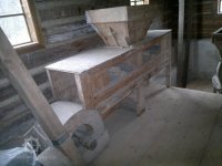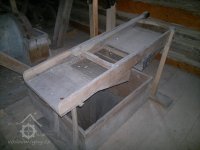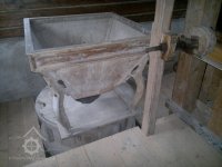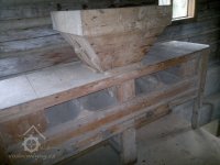 -- moučný hranolový vysévač (3 síta), řemeslně provedený, zdobné prvky na dřevěných konstrukcích, počátek 20. stol.