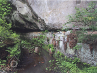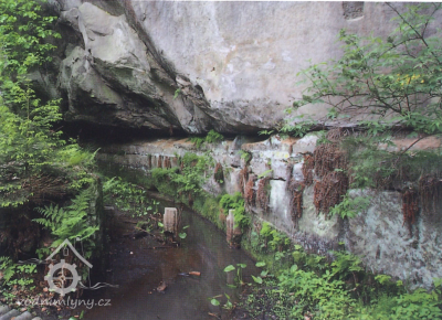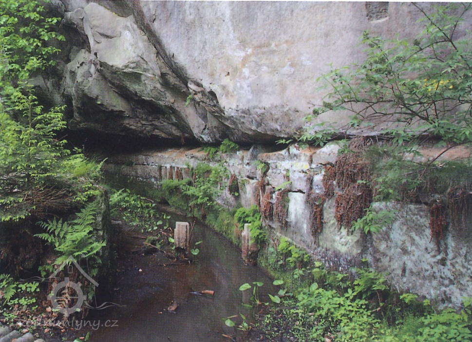 Zachován ve skále vytesaný náhon obcházející hráz zaniklého Žluňského rybníka (nemůže se tudíž jednat o výpusť rybníka) s oboustranou rýhou pro osazení stavěcích fošen (případně i pohyblivého stavidla)