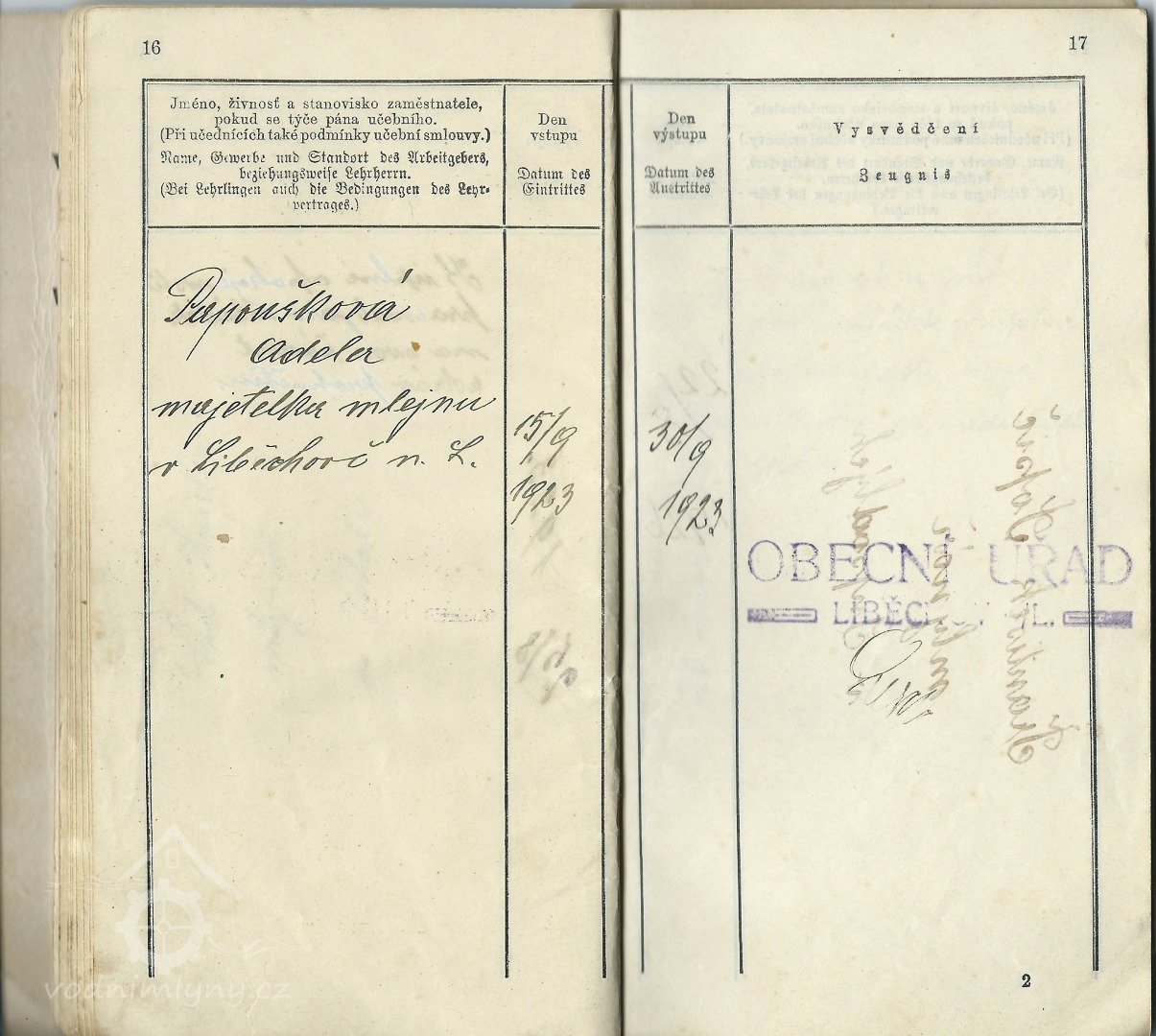 Výuční list Josefa Golbrichta, 1921, © Umělecký mlýn Liběchov, (Prvky na obrázku: výuční list)