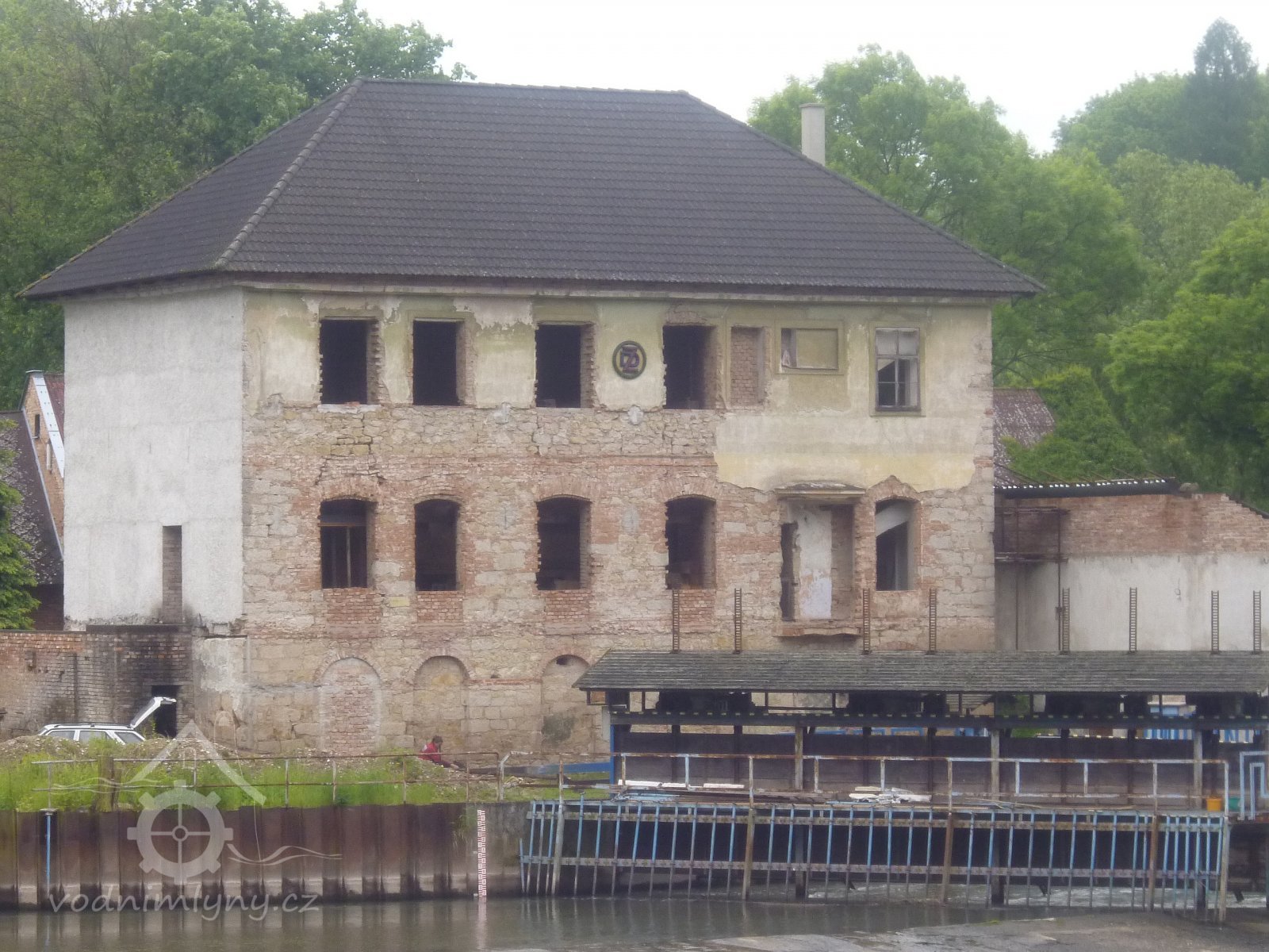 Na budovách znak Dražických závodů, které mlýn-elektrárnu vlastnily ve 20. letech 20. století.