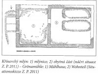 přízemní budoiva 21 x 12 m, rozdělea příčkou na větší obytnou místnost a menší mlýnici, další obytné místynosti byly v mansardě