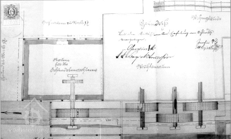 1930: 3 kola na svrchní vodu, hltnost 3 x 0,08 m3/s, spád u všech 3,6 m, celk. výkon 7,2 HP