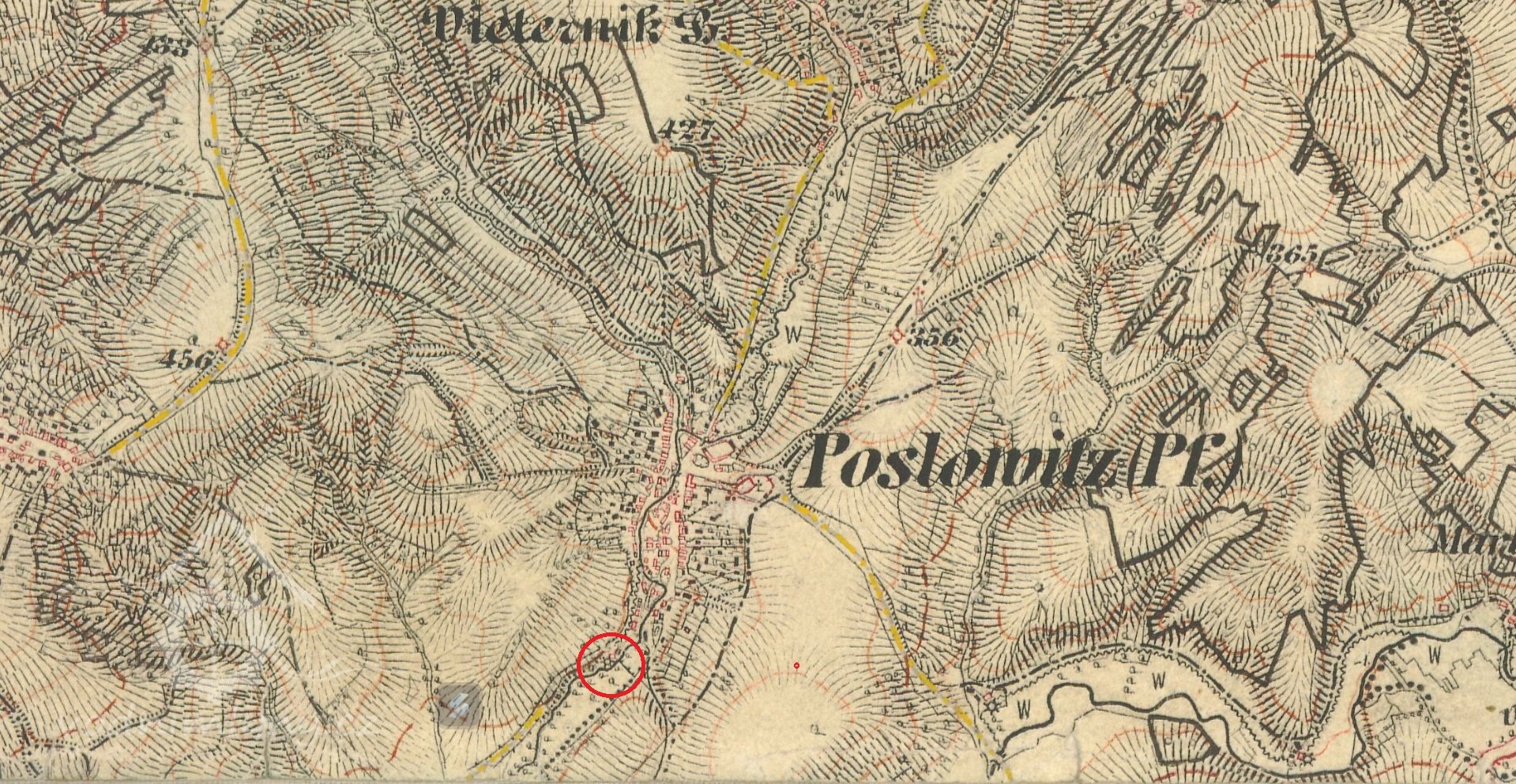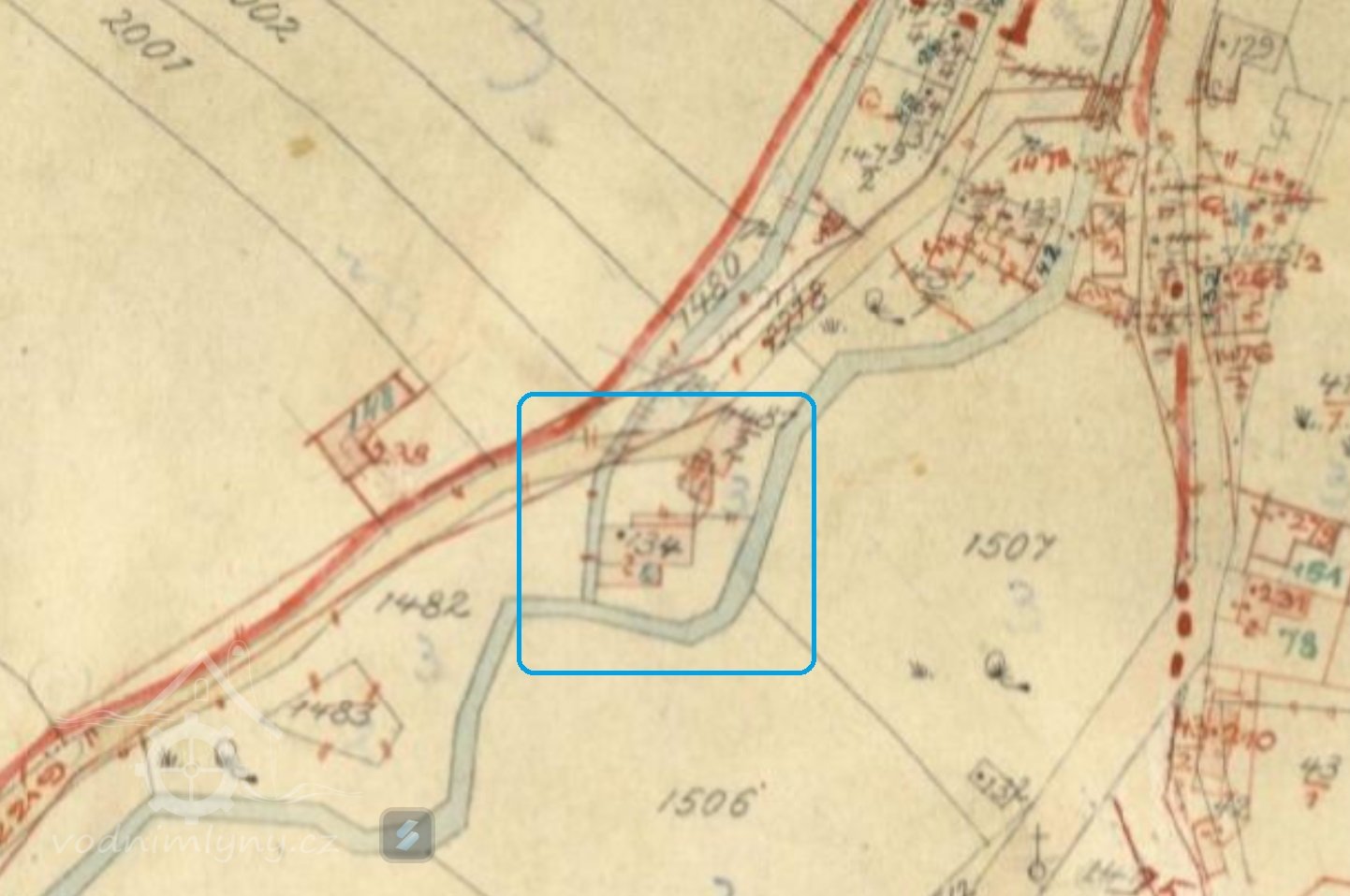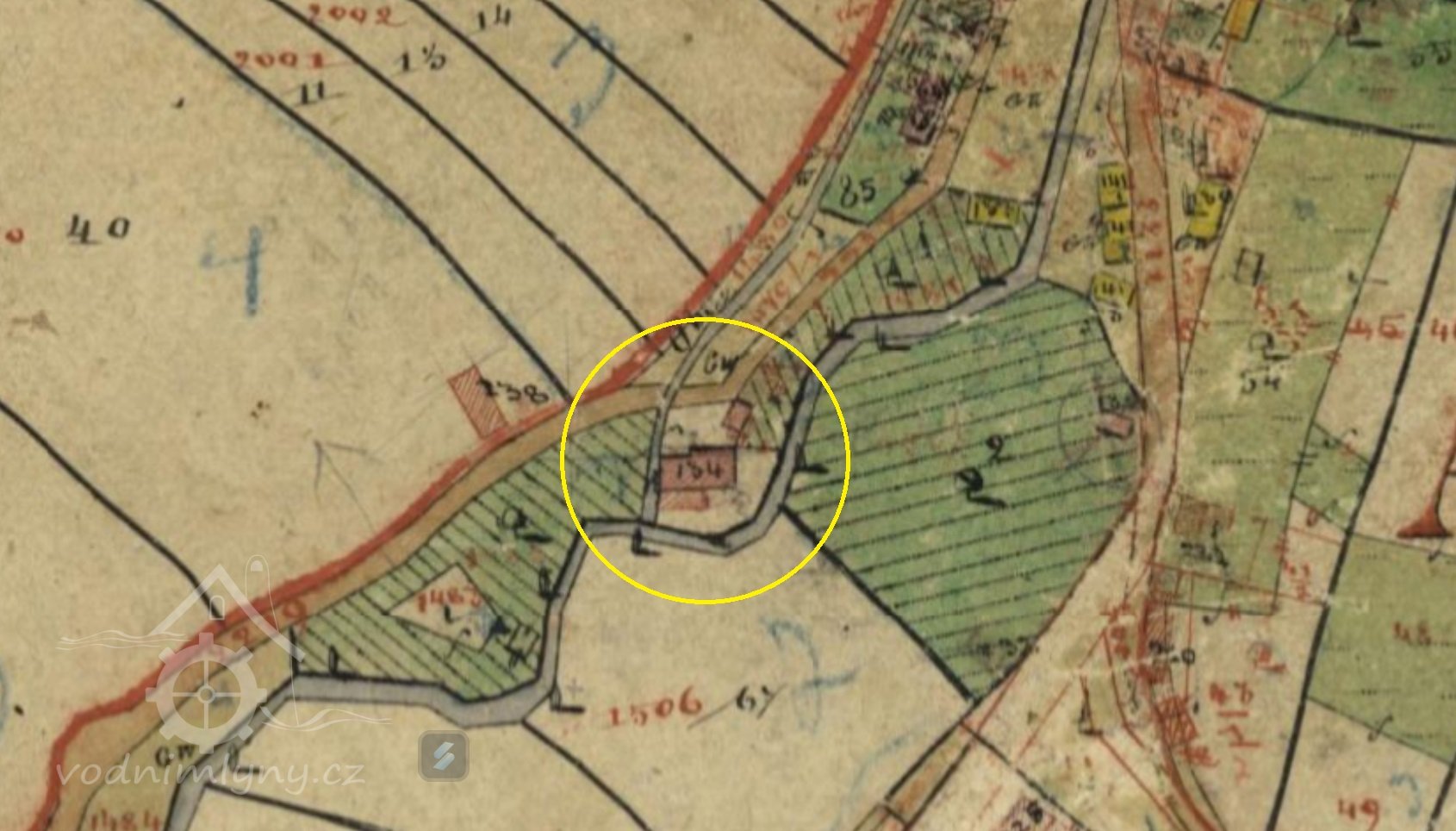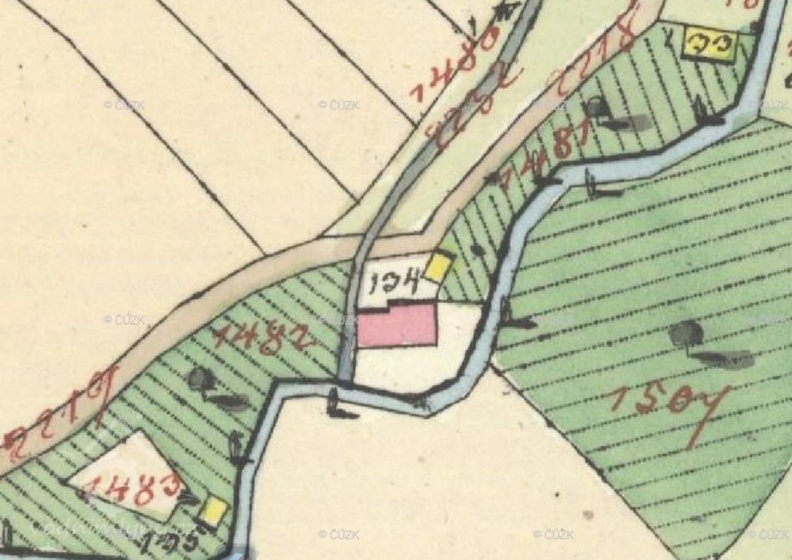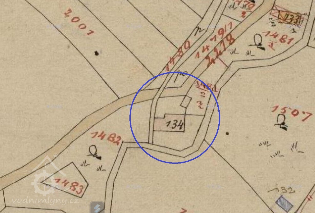 Vodní stav pro mlýn byl na potoce u č.8. Odtud tekla voda před čísly 7 a 5, pak za čísly 86, 80, 81, 94, 85 až k č. 1.