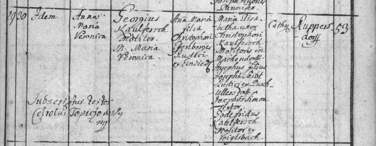 Rok 1780 – mlynář Georg Kaulfersch s manželkou Marií Veronikou, nerozeny zde děti Maria Anna (1780), Maria Theresia (1782), Maria Anna (1783). Kaulferschovi odsud odešli na nedaleký mlýn čp. 60, kde jsou uváděni roku 1789 a kde dosud hospodařil mlynářův příbuzný Johann Christoph Kaulfersch. Na mlýn čp. 53 přišel Georg Salomon, který byl také pekařský mistr. Za manželku měl Dorotheu, rozenou Simon, v lednu 1790 se jim zde narodil syn Anton Franz Josef a v záři 1792 dcera Dorothea Eva Elisabetha.
