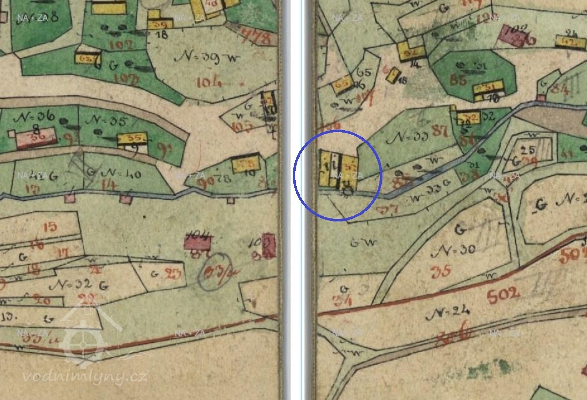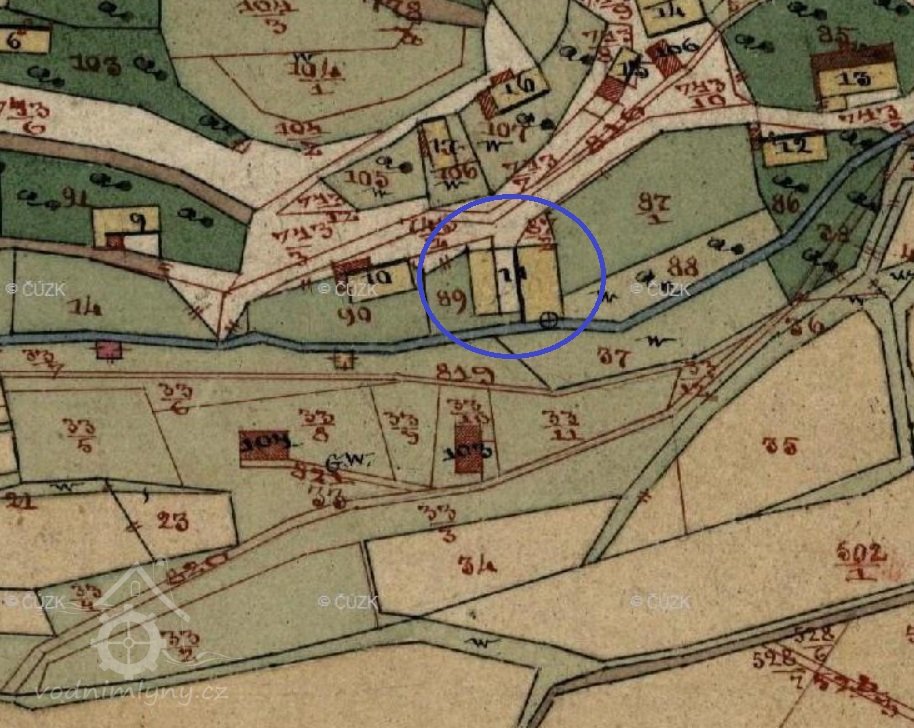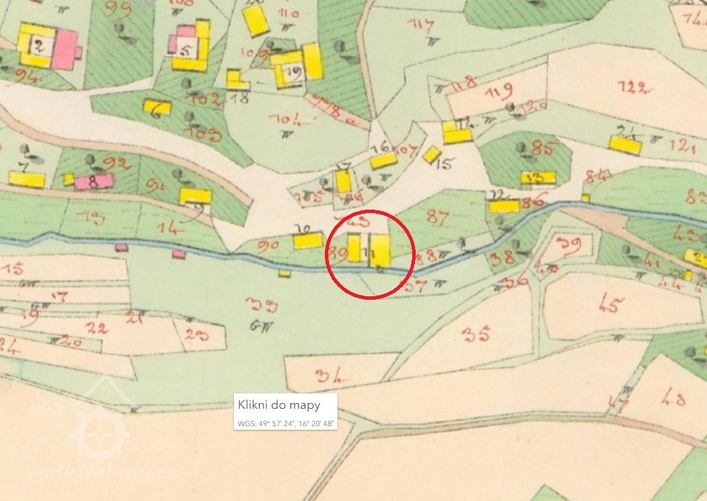 Vodní kolo mlýna - průměr 3, 85 m, sv. šířka 80 cm, hl. korečků 27 cm - bylo r. 1915 vyměněno za Francisovu turbínu v souvislosti se změnou provozu.