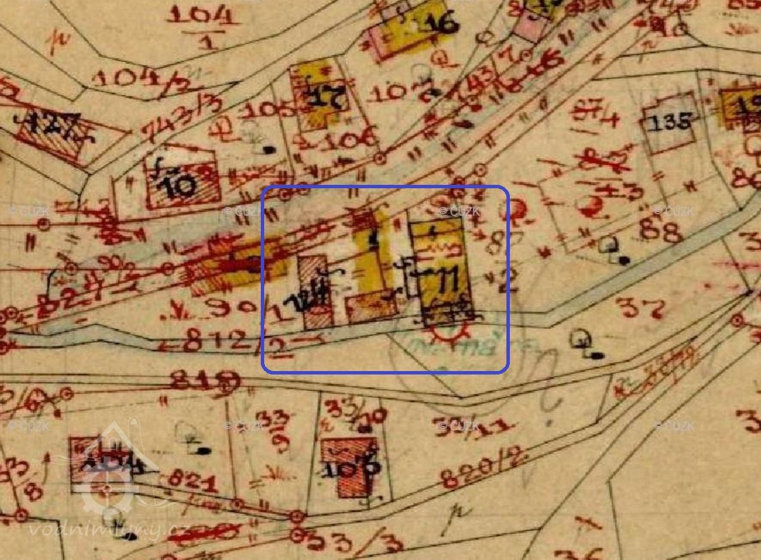 Dřívější mlýn byl Adolfem Flonerem přebudován na výrobnu dýmek. Povolení k přestavbě a rekonstrukci dostal 25. 7. 1914, povolení k výměně kola za Francisovu turbínu 8. 5. 1915. V roce 1938 zřídil Josef Medáček u dýmkárny pilu ležačku poháněnou vodní turbínou. Potok se dříve nazýval Husí krk.