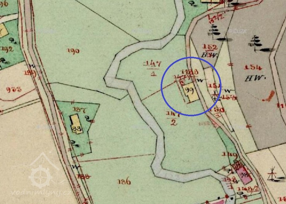 Na císařském otisku a indikační skice zakreslen, ale nikoliv jako mlýn.