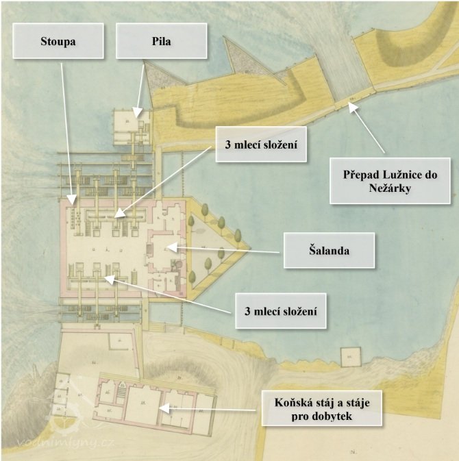 ze  mlejna ročně vychází: 40 strychů pšenice, 155 str. žita. 14 str. ječmene, 40 str. prachu, 10 str. opišků