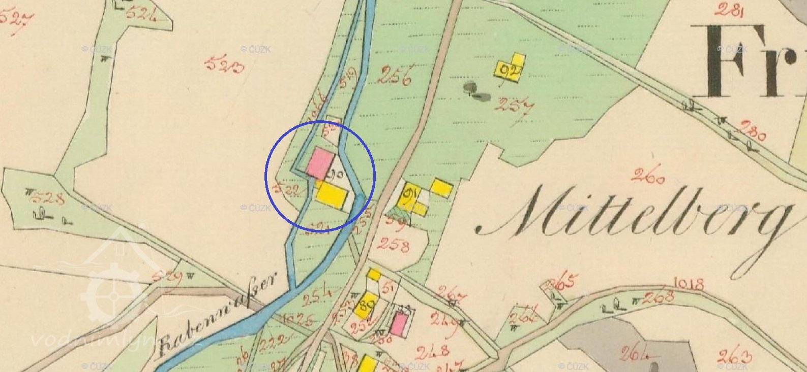 Popis1930: 1 kolo na svrchní vodu, hltnost 0,091 m3/s, spád 4,15 m, výkon 3,25 HP