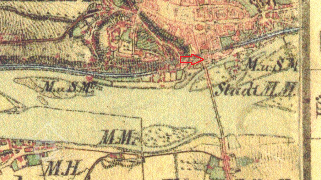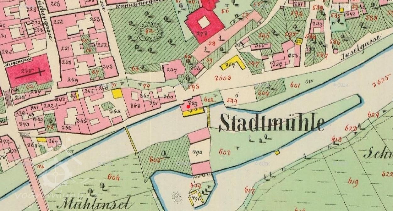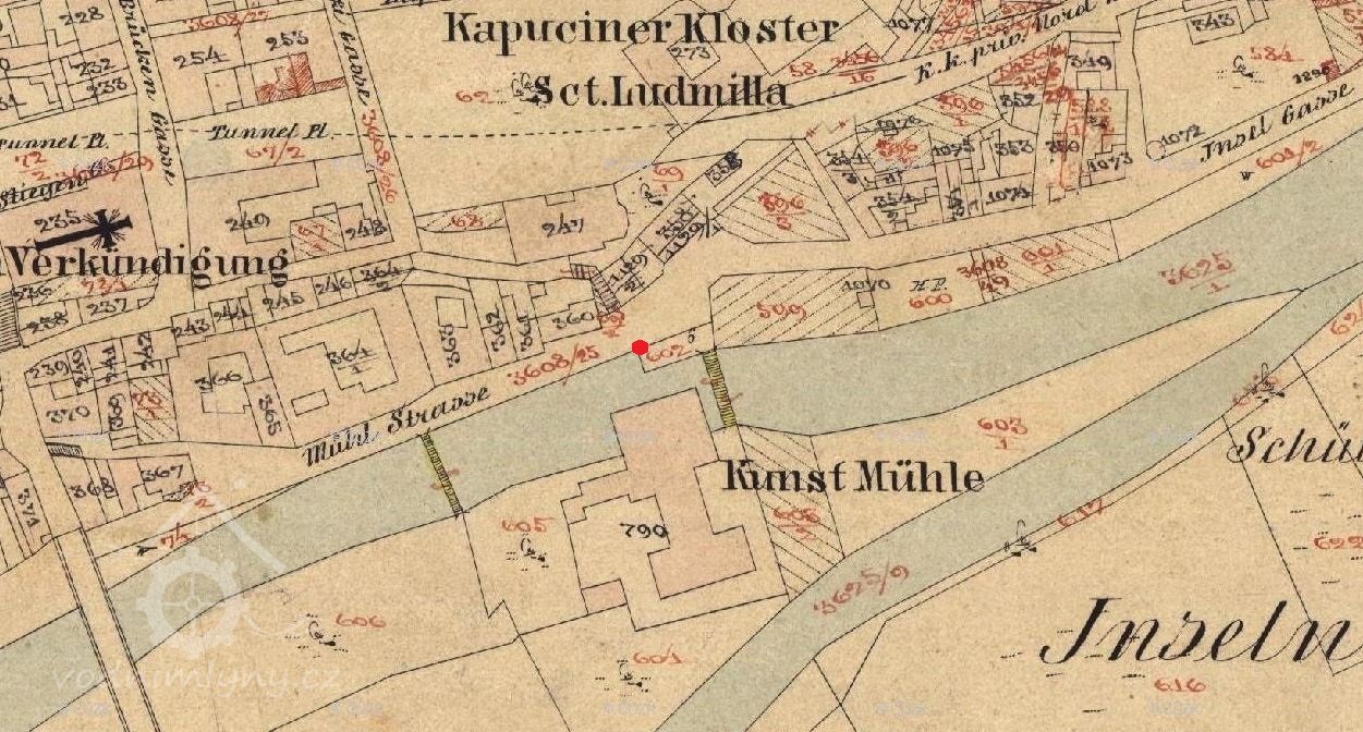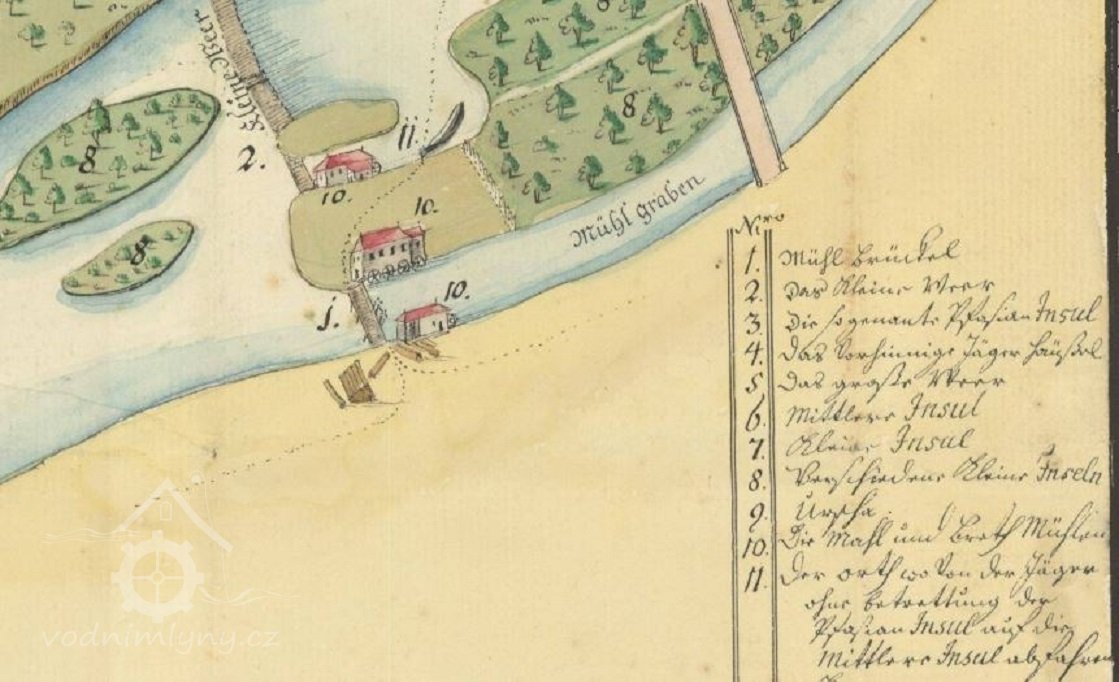 Starý mlýn, později pila zbořená v souvislosti s výstavbou železniční tratě, v době kdy byl v sousedství na ostrově zprovozněn nový moderní mlýn.