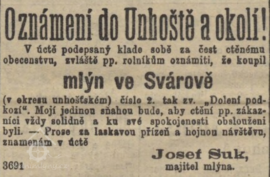 Další zpráva je z počátku 20. století, kdy se do rodiny Hořovského přiženil pan Živnůstka, ředitel nějakého cukrovarnického podniku, velice bohatý pán z Prahy. Ten měl dvě dcery, velice afektované slečny, a postavil jim roce 1925 u mlýna tenisový kurt. Vesničané z Podkozí se na tenis chodili dívat jako na nějakou vzácnou podívanou. Pak Živnůstka zemřel, jedna dcera se provdala za plukovníka československé armády a nikdy už do mlýna nepřijela. Druhá dcera se také provdala a později ovdověla. Fajmanovi, který byl ve mlýně stárkem a byl ženatý, vdova padla do oka. Svoji manželku, která byla velice hodná ženská, utrápil. Byl to jeho záměr a tak dlouho mluvil do Živnůstkovy dcery, až si ji vzal. Pak se zase rozvedli. Mezi Fajmanem a Živnůstkovou bylo šest dětí, dvě Fajmanovy, dvě Živnůstkové a dvě jejich společné. Fajman byl hrozně chtivý majetku a za války šmelil. Do mlýna jezdilo kladenské gestapo pro mouku, kterou jim musel dávat. A kryl si záda na všech stranách. Do jedné, té nejnovější Sokolské chaty v Mirodolu se prokopal a měl v ní skrýš pytlů mouky. Po válce na něj spravedlnost dokročila a dostal malý dekret. A tím to skončilo. Pak všechny mlýny komunisté zrušili a Fajman, se kterým se mlynářka rozvedla, přežíval v Podkozí v nějaké chaloupce a našel si místo v gramofonových závodech v Loděnici, kde byl zaměstnán při drcení směsi na lisování gramofonových desek. Mlel vlastně pořád, ale "černou mouku".