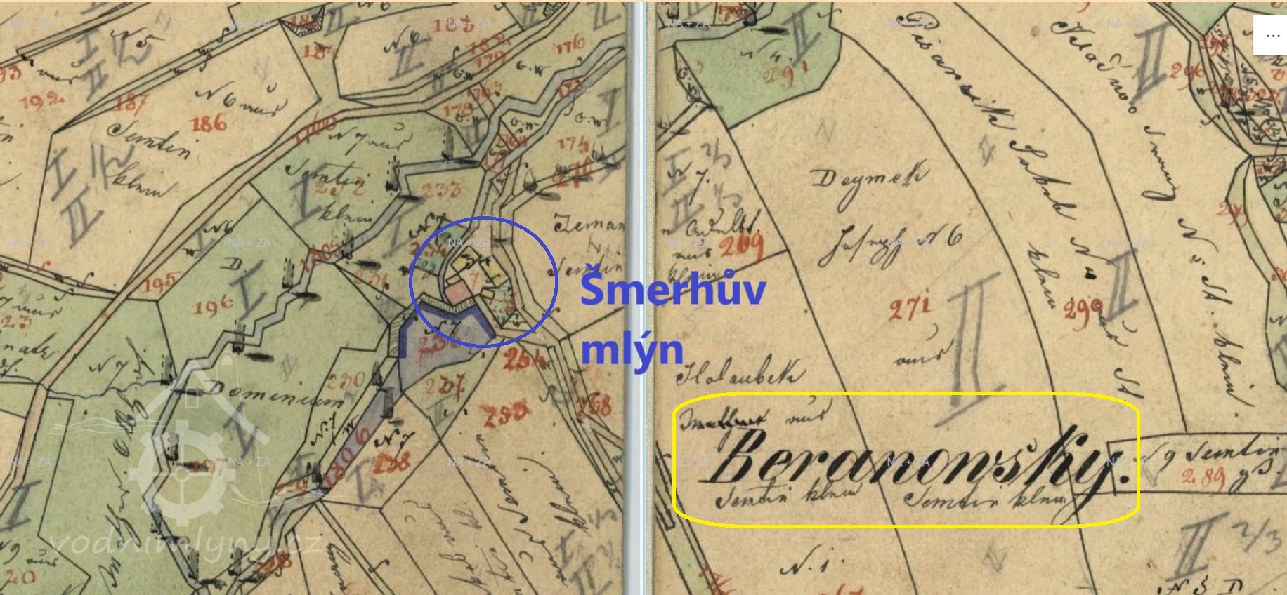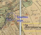 1654 Berní rula: u vsi Olbramovice vedle mlýna Šmerhového místo pusté, kde dříve mlejn Beranovskej bejval, z něhož se ročně platila 1 kopa úroku