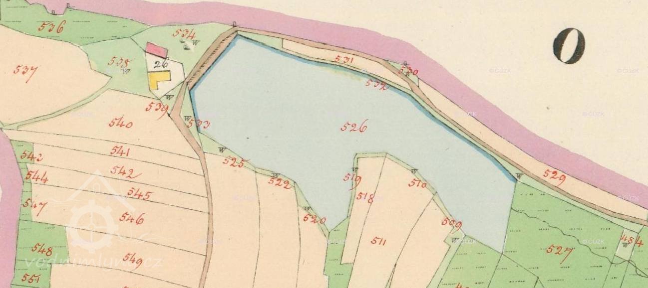 Voda se přivádí na mlýn a stoupy žlábkem z rybníka č.parc.526.