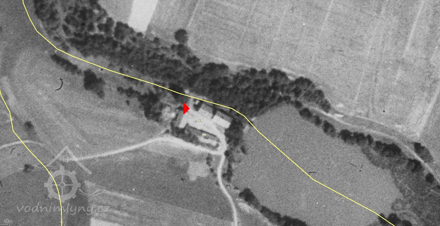 ...Voda na mlýn přiváděna jest z rybníka č.parc.526 betonovým krytým žlabem o světlosti 24x21 cm. U vtoku do žlabu je zřízeno uzavírací stavítko. Od výtoku betonového žlabu vede se voda dřevěným žlabem o světlosti 38x28 cm na kolo.