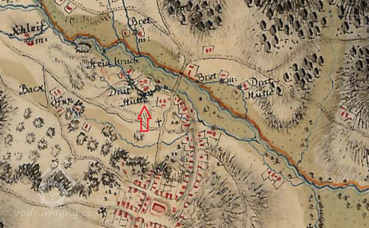 Mlýn zřízený ve druhé polovině 18. století při drátěné huti, která později zanikla. Koncem 19. století byl mlýn přestavěn na továrnu na zátky, která po úspěšném působení zanikla po 2. sv. válce. Po její demolici byl na pozemcích vybudován areál Dřevokombinátu.