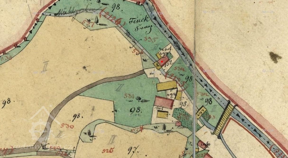 Mlýn byl původně součástí hospodářství čp. 98, ke kterému patřila i pila níže pod mlýnem, později mlýn dostal vlastní číslo popisné a po definitivním rozdělení hospodářství a následně zrušení mlýna zde byla zřízena továrna na zátky, jejíž součástí byla také pila.