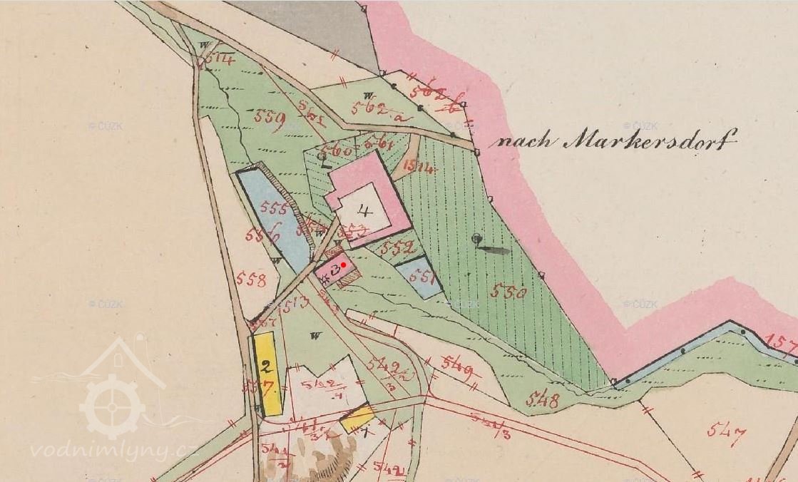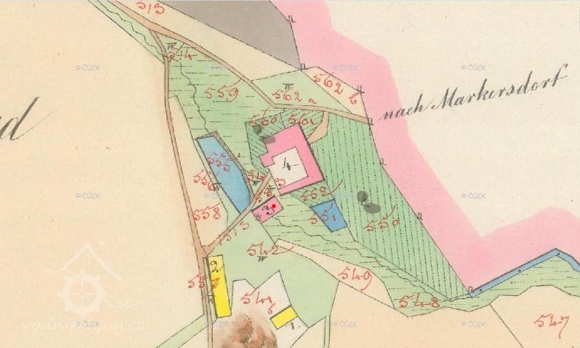 Mlýn se nacházel přímo pod hrází malého rybníka, který zanikl současně s mlýnem.