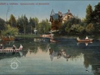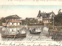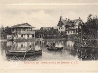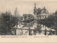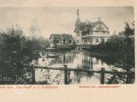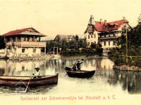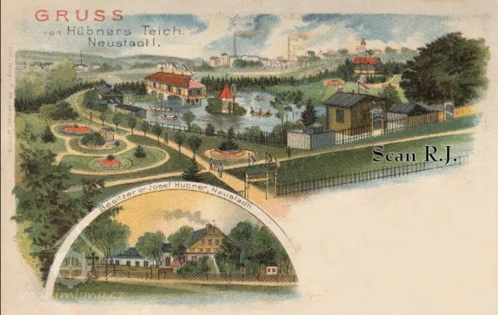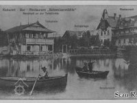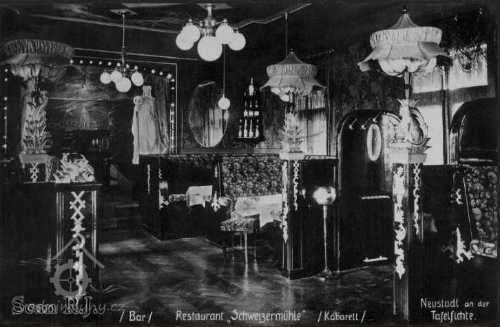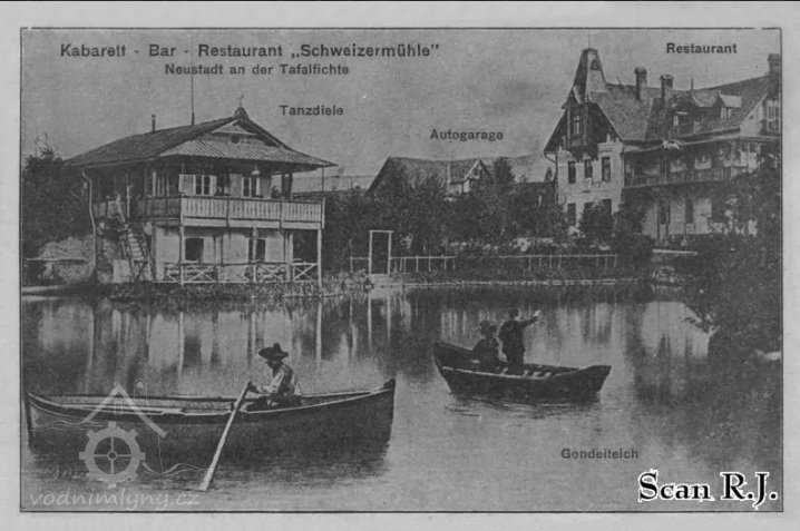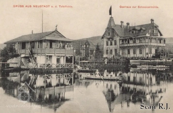 Původní luxusní hostinec Zur Schweizermühle (Švýcarský mlýn) byl velmi oblíbeným návštěvním centrem. Mlynář Hübner zde na počátku 20. století založil zábavní podnik, jenž sestával z honosného restaurantu, rybníčku s možností plavby na gondolách, tanečního parketu na umělém ostrůvku uprostřed rybníčku, a zahrady. V prostorách podniku fungoval i luxusní nevěstinec. Po válce hostinec zanikl a sloužil jako drůbežárna, později část komplexu vyhořela a zbývající část spadla. Polovina nádrže byla poté zasypána a na zamrzlé části nádrže se v zimě hrával hokej. Místo je dnes zarostlé, bez vody, a je tu navíc černá skládka. Zarostlé ruiny je možné najít na pravé straně cesty ke kravínu kolem evangelického kostela.