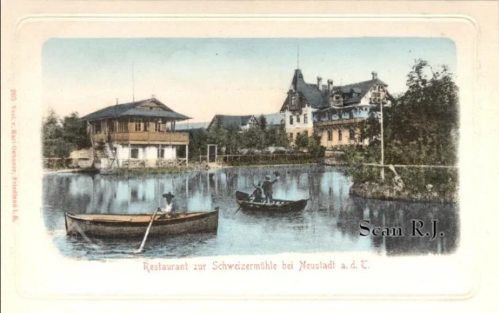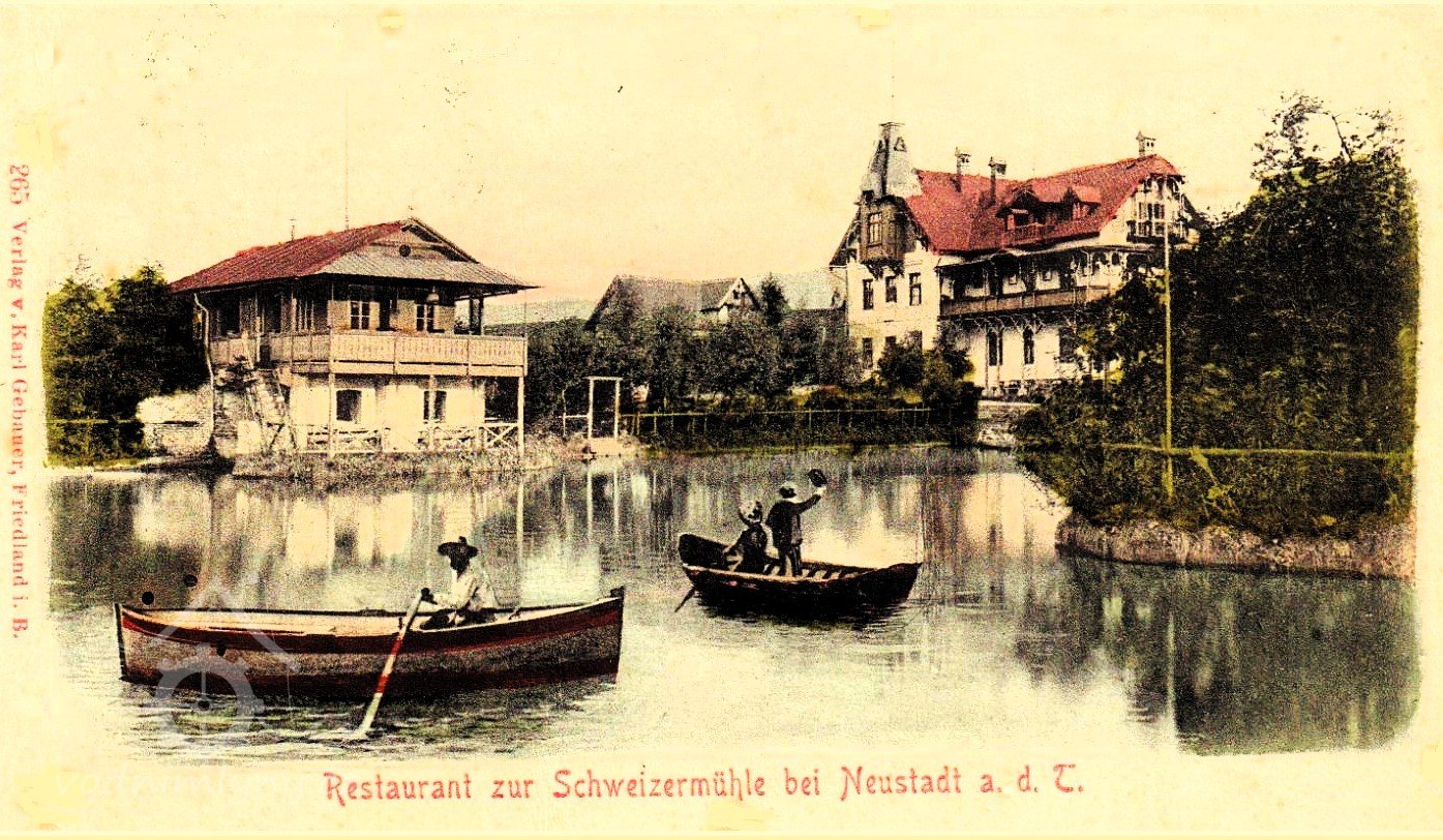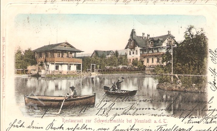 Také si to tak pamatuji . Vyprávěla mi jedna paní, německé národnosti, že majitelka Schweizermuhle si vzala vojáka pana Wenzela Nováka a před smrtí mu doporučila jeho budoucí manželku. Protože to byl náš soused který bydlel v bývalé restauraci Reichstagrenze znal jsem ho. Žel pamatuji si jenom na pohřeb této druhé manželky. Ale třetí manželku si pamatuji lépe. Pan Novák s ní provozoval dlouho restauraci na nádraží v N.M.