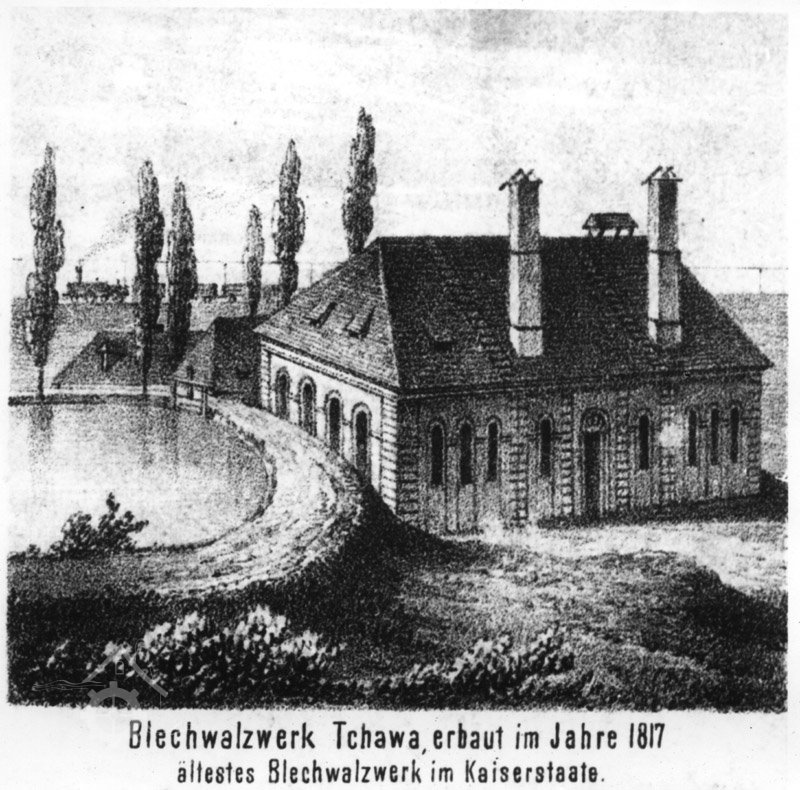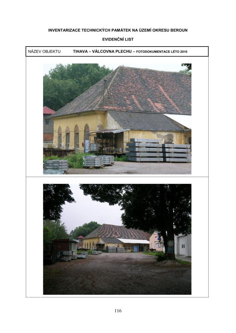 Zvýšená potřeba plechů, zvláště pro stavbu parních kotlů, vedla k zavádění válcoven místo dříve obvyklých kovacích hamrů. První válcovnu plechu na svém panství postavil Rudolf hrabě Vrbna roku 1823 v Tihavě u Hořovic. Válcovna, empírová budova o půdorysu asi 20 x 40 metrů byla zřízena pod hrází hutního rybníka. Její mimořádné technické vybavení umožňovalo na svou dobu dokonalý provoz. Válcovna byla uzpůsobena pro čtyři válcovací stolice, ke každé náležely dvě ohřívací pece, vytápěné uhlím. Dalším zařízením byla zkujňovací výheň, dmychadlo a mechanické kovací kladivo s vlastními vodními koly. Součástí válcovny byly rovněž dvoje nůžky k ostřihávání plechu s vodním pohonem, dva jeřáby pro manipulaci s těžkými součástmi pracovních strojů a horizontální soustruh k obrábění válců. Postupovalo se tak, že předkovaná železná plošina se rozstříhala na potřebné rozměry a po ohřevu vyválcovala na tzv. klopy. Ty se uprostřed přehnuly a zamočily do koše z uhelného prachu a hlíny, aby se při následujícím tváření nesvařily. Po dalším ohřevu se klopy několikrát válcovaly na plech požadované tloušťky. Válcovna v Tihavě zůstala v provozu do padesátých let 19. století, kdy byla dalším majitelem Vilémem z Hanau přestavěna na mlýn. Poté sloužila pro různý dílenský provoz. Budova nejstarší válcovny v Čechách stojí dodnes a je zapsána na seznamu kulturních památek. Je v soukromém vlastnictví a slouží k drobnému podnikání. Vnitřní zařízení se nedochovalo, k dispozici jsou nákresy a podrobný popis válcovny, který pořídil roku 1824 hutní odborník a písař šichtovního úřadu železáren v Novém Jáchymově František Herda.