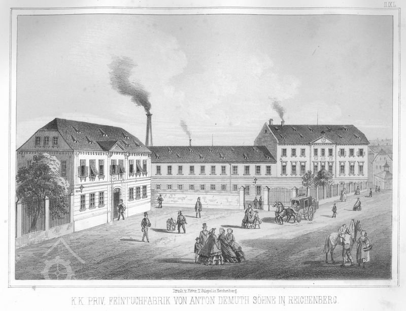 Továrnu nechala postavit firma Antona Demutha, který patřil do první generace továrníků-obchodníků. Společnost založil Anton Bernard Demuth již v roce 1808 a v roce 1826 převzal i klientelu svého tchána Gottfrieda Mölera patřícího do stejné skupiny obchodních a továrních pionýrů. V roce 1835 koupil rochlický mlýn, který přestavěl na dodnes existující továrnu stojící nedaleko Poštovního náměstí, v roce 1842 nechal postavit další tovární blok v samém centru Liberce. Roku 1852 byla továrna na dnešní třídě 1. máje dále rozšířena, další přestavba proběhla pod dohledem architekta Antona Ferdinanda Miksche v roce 1870. Zaříznutí jedné budovy tak, aby vyhovovala uliční linii, proběhlo v roce 1909. Dochovaná empírová hlavní budova se dnes nachází ve vnitřním bloku. Trojúhelníkový empírový štít je sice narušen dostavbou strojovny výtahu, ale stále nese i kulaté okno štítových hodin. Spolu se Schmidtovou továrnou na Papírovém náměstí se jedná snad o nejzachovalejší tovární objekt z první poloviny 19. století v Liberci.