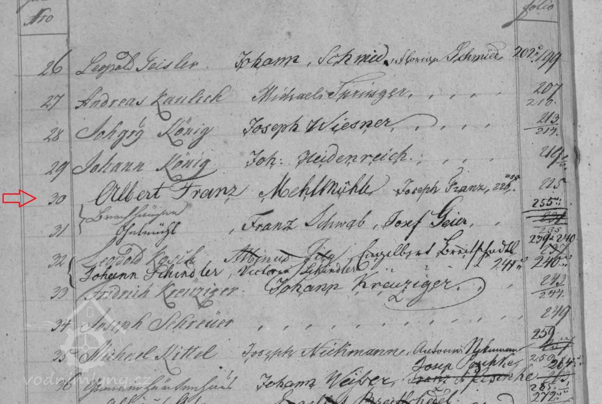 V roce 1838 mlýn vlastní Albert Franz, kterému patří také statek čp. 48 v sousedství kostela. Majetkové propojení spadá zřejmě již do roku 1806.