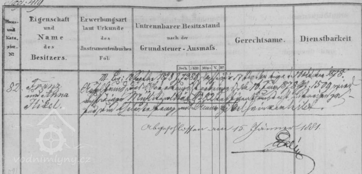Nejstarší mlynář Pavel je doložen v letech 1632 - 1635. Spravoval asi dolní mlýn. V průběhu následujícího třicetiletí se objevují další mlynáři, jednorázově Matyáš (1636) či Jiří (1654) a opakovaně hned čtyři osoby. V 30. a 40. letech 17. století souběžně pracovali Václav (činný 1636-1650 na horním mlýně) a Martin (činný 1636-1647 na dolním mlýně?). Po nich pak následovali Jakub (činný 1654-1666 na horním mlýně?) a Jan (činný 1662-1674 na dolním mlýně?). Rozklíčovat vzájemné vztahy mezi těmito mlynáři je z důvodu neúplných matričních záznamů složité a můžeme je jen odhadovat. Pavlovi se v roce 1635 narodil syn Jan. Ten bude nejspíš totožný s mlynářem Janem činným v letech 1662-1674. Jméno mlynáře Václava je zmiňováno v Hýklově kupní smlouvě na horní mlýn z roku 1693 (viz níže). Václavovi se v roce 1647 narodila dcera Zuzana (zemř. asi 1689). Stejné jméno měla i první manželka Mikuláše Sudolského, který se do Veřovic nejspíše přiženil z Bludovic či Žiliny a který na konci 60. let ovládl mlynářské řemeslo ve vsi. Až do roku 1692 mu patřil horní mlýn. Sudolský však neměl syna, kterému by mlynářské znalosti předal. V závěru svého života stačil zplodit jen dceru Kateřinu (1690-1753). V roce 1693 proto koupil horní mlýn Jan Hýkl (zemř.1709) z Rybího, poté, co se oženil s vdovou a druhou Mikulášovou manželkou Annou. Hýklovi následovníci jsou pak na č.p. 82 nepřetržitě usazeni až do 20. století, tzn. více než dvě stě let minimálně po osm generací (od 1709 Jan H., od 1764 Josef H., kolem 1791 Jan H., po 1801 Josef H., od 1842 František H., po 1860 Jan H., od 1879 František H.).