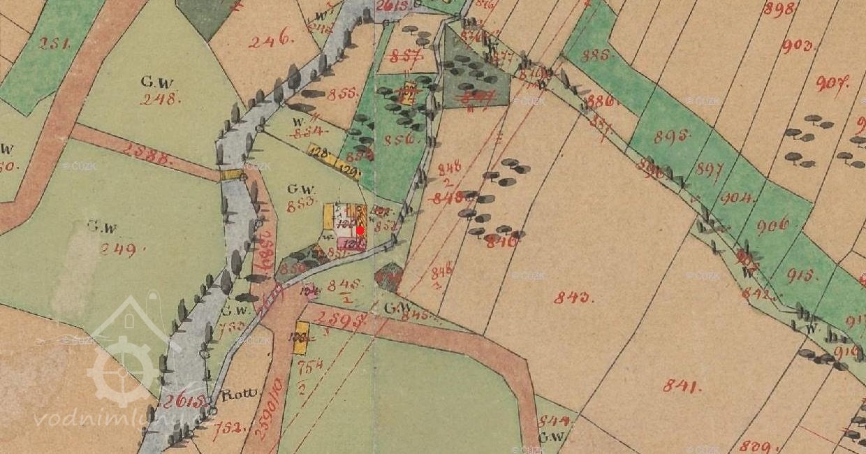 PopisV roce 1930 mlýn pohání kolo na svrchní vodu s průtokem 0.075 m3/s, spádem 4.3 m o výkonu 2.8 HP.