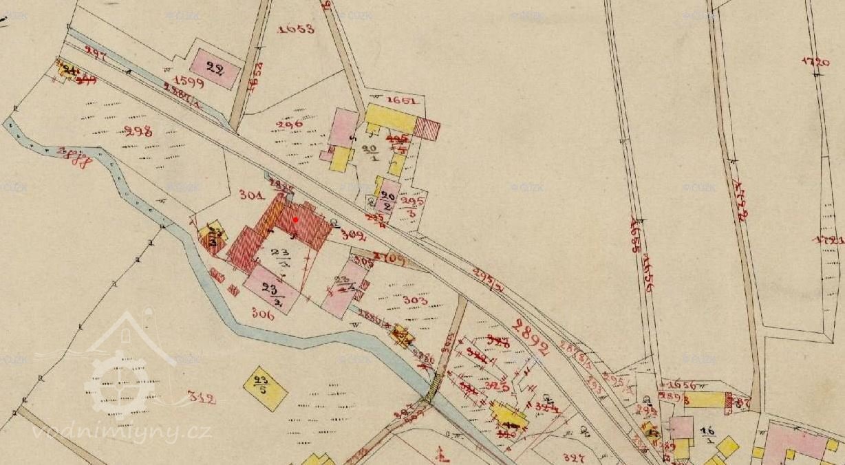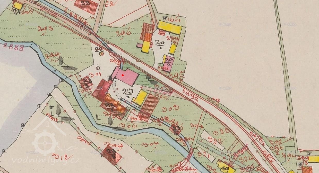 PopisV roce 1930 pohání pilu kolo na svrchní vodu s průtokem 0.215 m3/s, spádem 4.35 m o výkonu 8.5 HP.
