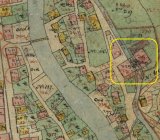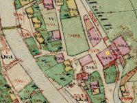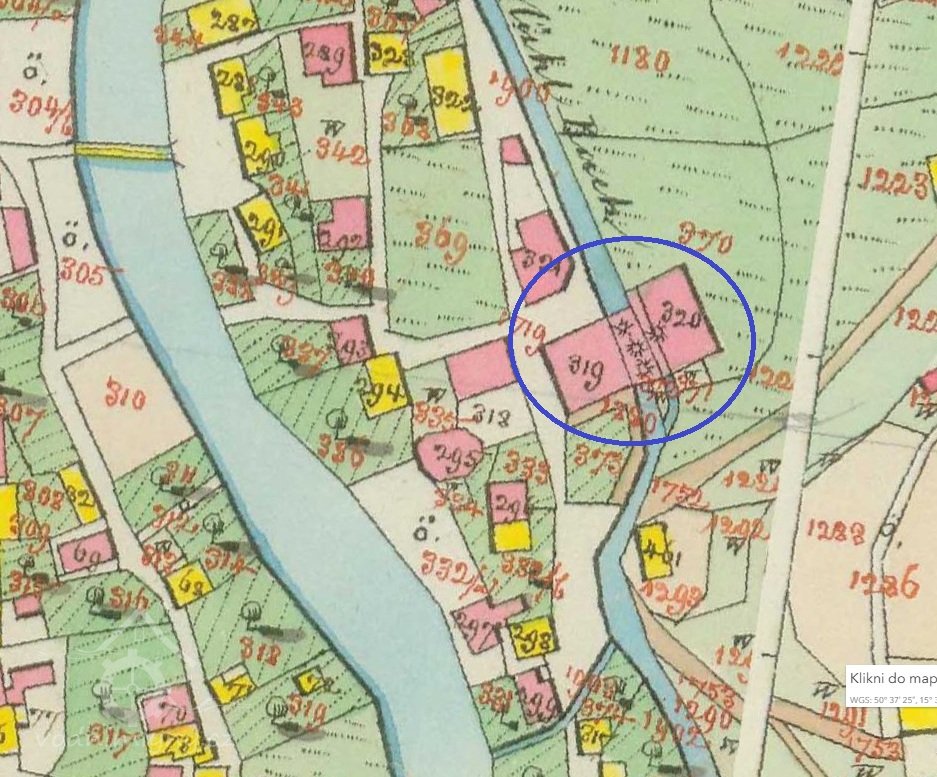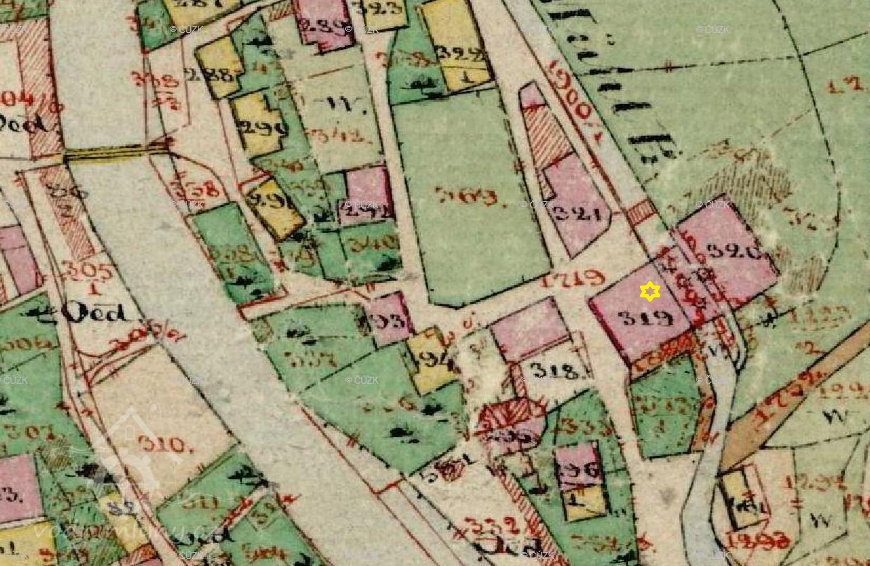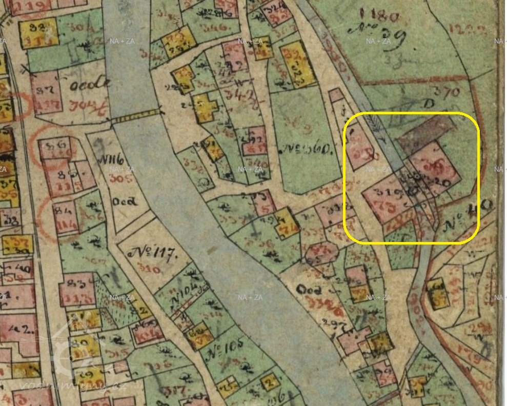 Na mapě stabilního katastru z roku 1842 je stavba označena jako obilný mlýn se čtveřicí vodních kol na Mlýnském náhonu. Na katastrální mapě evidenční z roku 1890 se průmyslový areál rozrostl zejména na východním břehu náhonu.