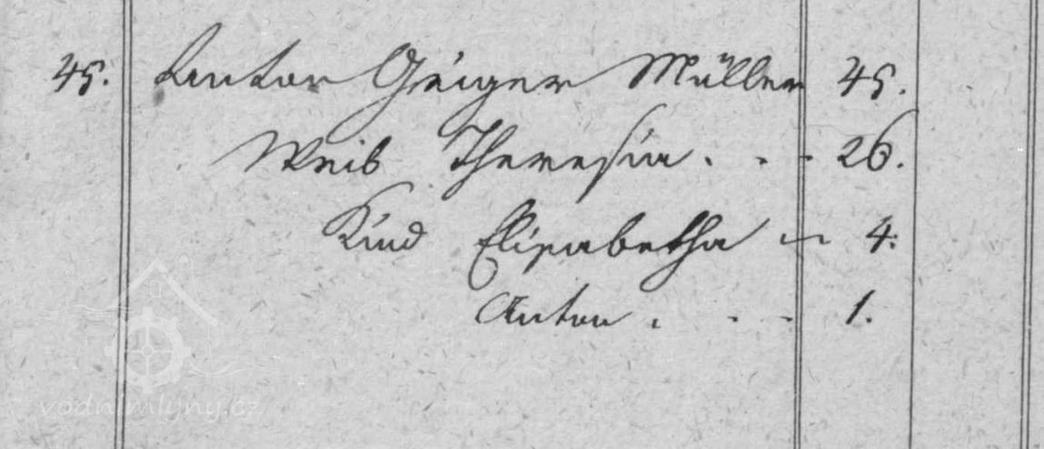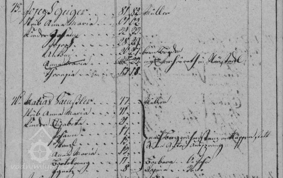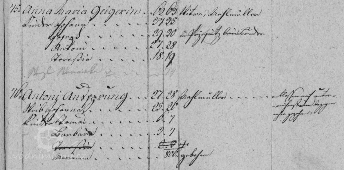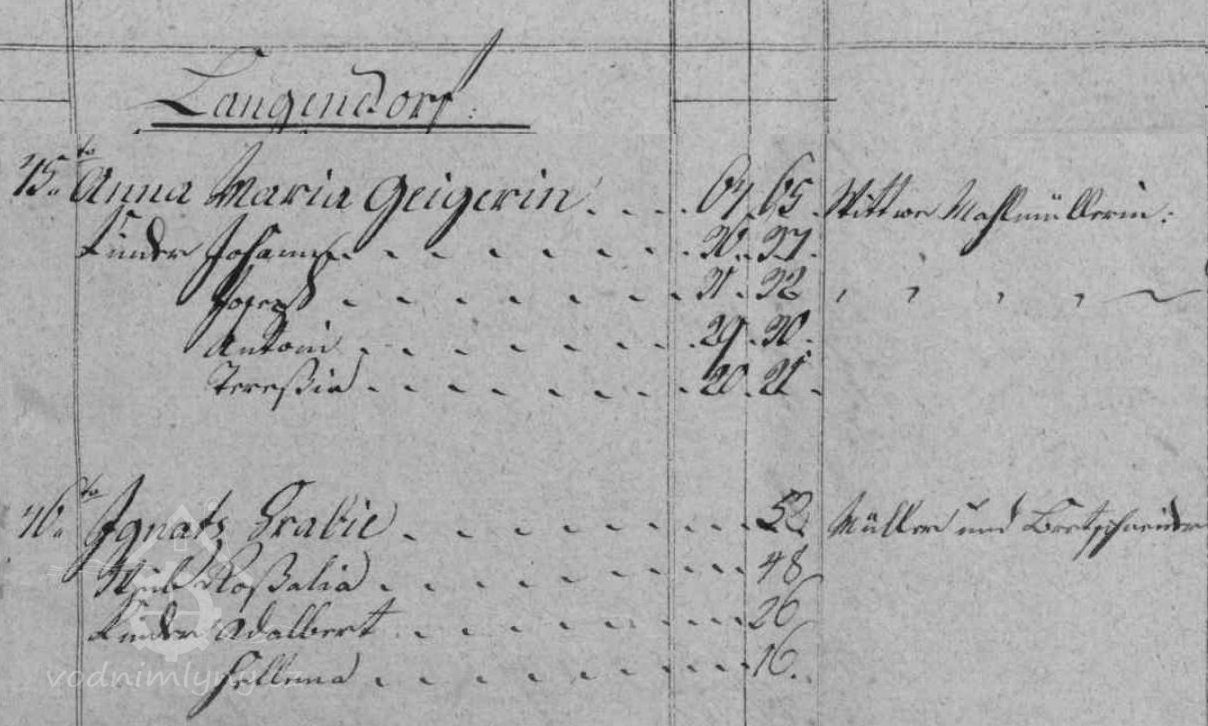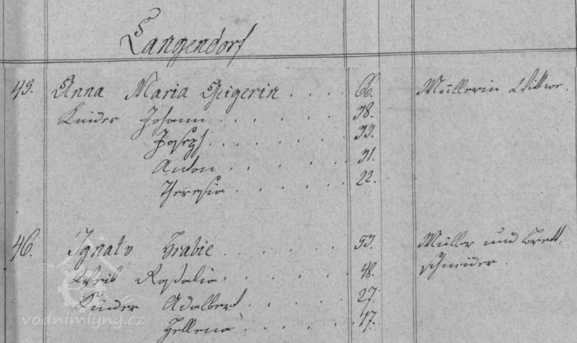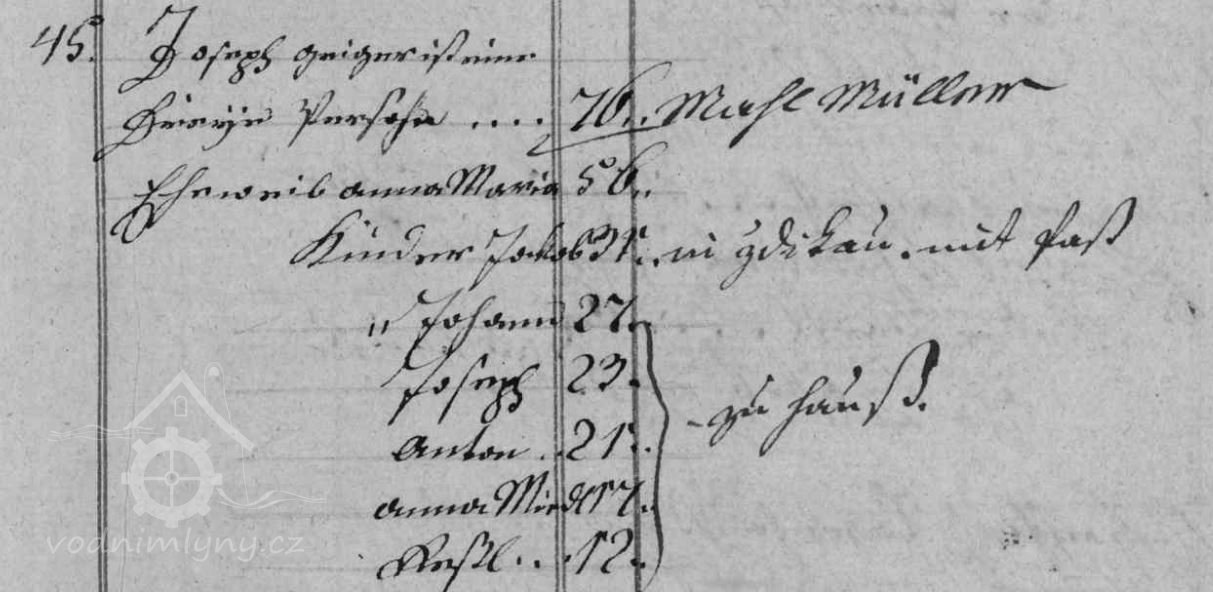 V soupise poddanách z roku 1799 je v čp. 45 uveden mlynář Jozepf Geiger, který mlýn vlastní do své smrti v roce 1806, mezi lety 1806 - 1815 mlýn vlastní vdova po mlynáři Anna Maria Geiger, od roku 1815 Johann Geiger a od roku 1819 Anton Geiger.