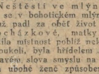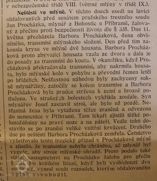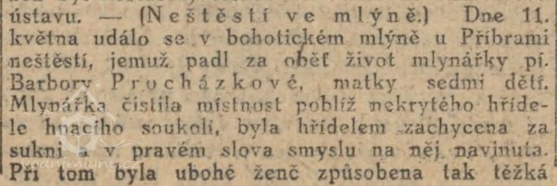 Mlýn v Bohosticích postihlo roku 1914 neštěstí zaviněné lidskou nepozorností a špatně zajištěnou technologií. Dne 11. května 1914 byla Barbora Procházková, žena zdejšího mlynáře Jana Procházky, zachycen převodním řemenem transmise, čímž ji byla způsobena vážná vnitřní zranění, kterým druhý den v příbramské nemocnici podlehla.  Její manžel, jakožto osoba zodpovědná za stav mlýna, byl následně souzen (a zproštěn viny) z přečinu ohrožení bezpečnosti života. (ŠJ)