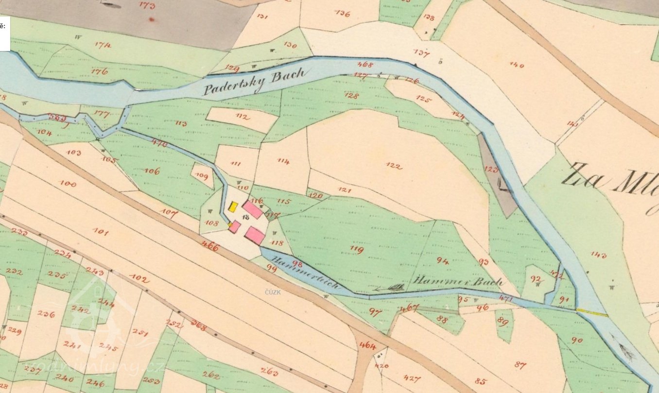 1666 1. zmínka - vodní mlýn s malým hamrem, náležel pod mirošovské panství