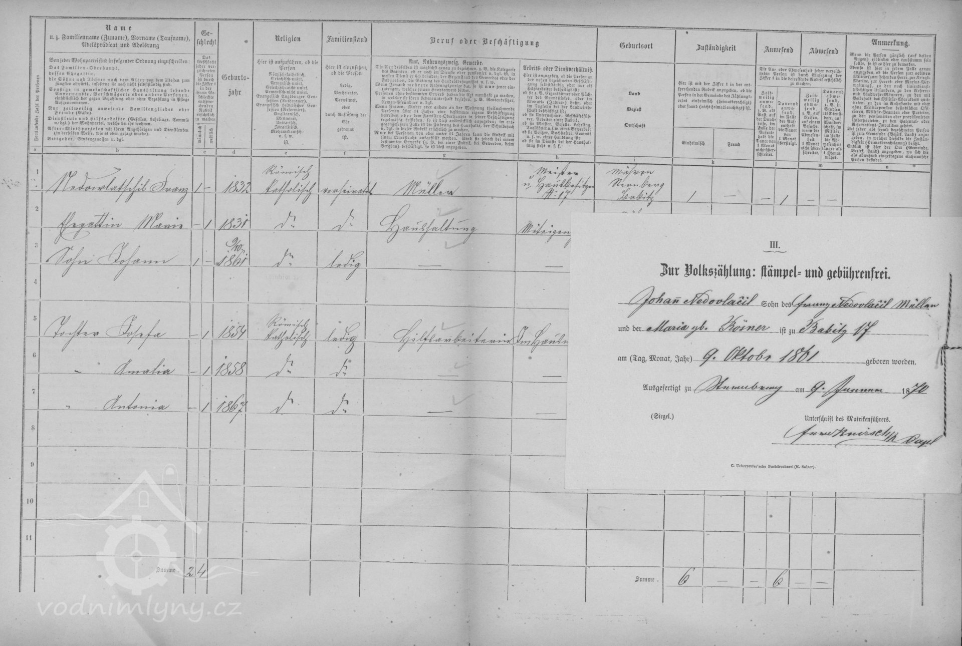 V roce 1859, 1869 a 1880 mlýn vlastní mlynář Franz Nedovláčil nar. 1832, manželka Maria roz. Röznerová, nar. 1831.