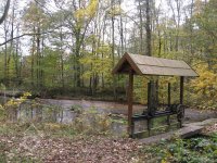 Zachován vyřezávaný sloup mlýnské hranice s iniciálami J.K. (Josef Kabeláč) a letopočtem 1819