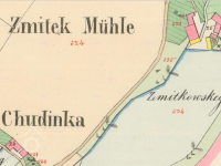 1936: v hrázi rybníka Zmítkovsklého, náležejícího Emilu Škodovi je umístěno stavidlo o světlé výšce 1,35 m, jehož otvorem vtéká voda do přívodního kanálu o světlé šířce 1,50 - 1,55 m a výšce 0,85 - 0,95 m, z něhož vtéká voda do dvou kašen o světlých rozměrech 163 x 160 cm a hloubce normální vody 200 cm.