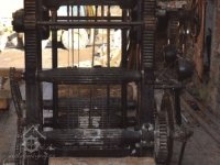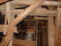 hlavní hřídel poháněna řemenovým převodem od turbíny, odtud vedly 3 svislé řemenové transmise k pohonu strojů