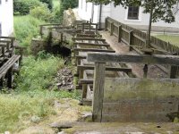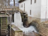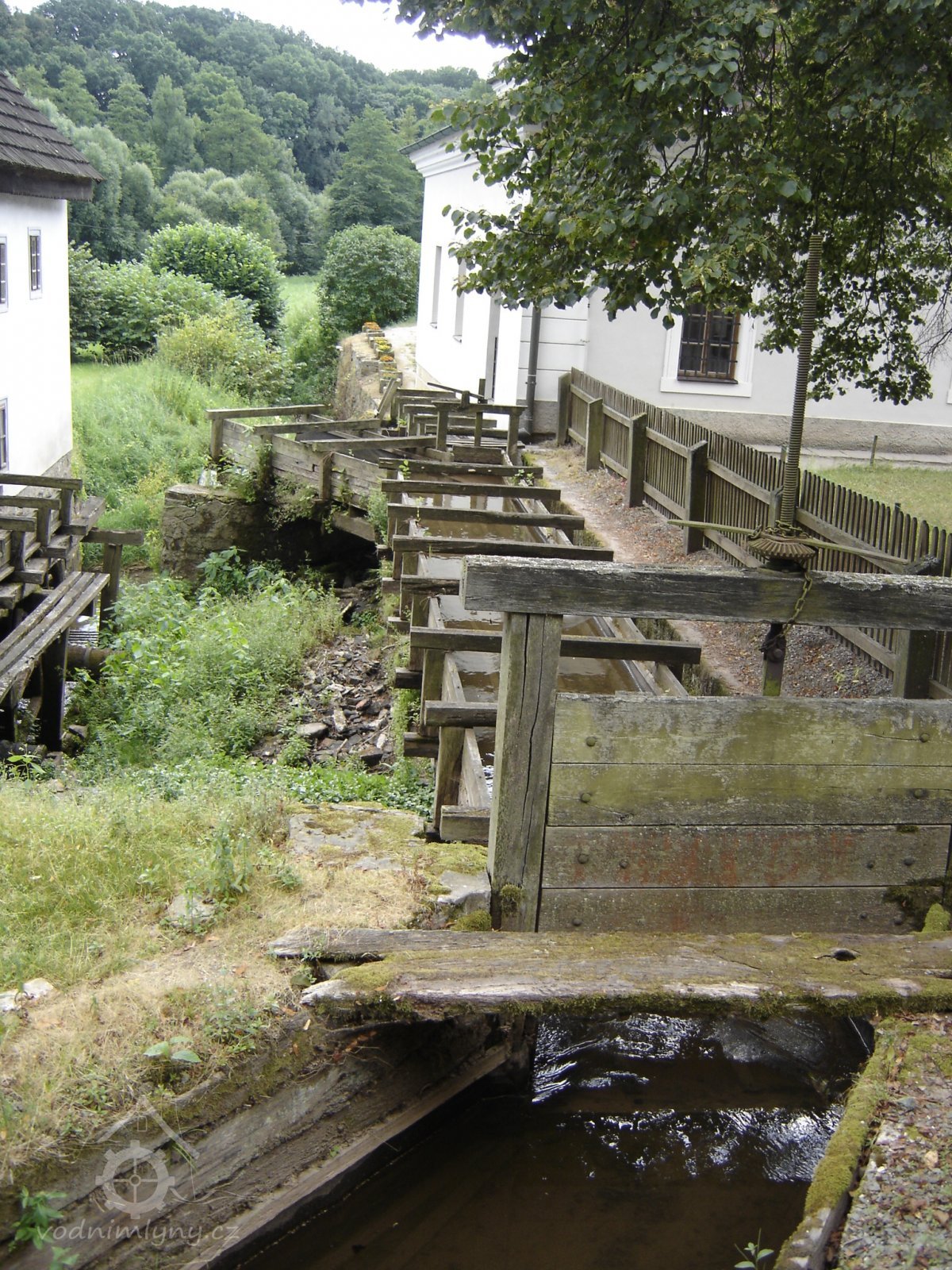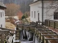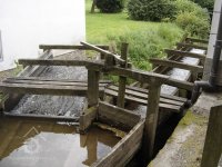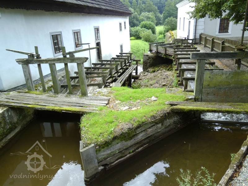 Voda z náhonu vedená přes stavidla na dvě zachovaná kola.