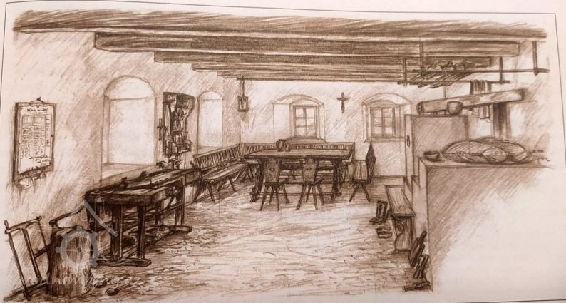 Inventář šalandy mlýna v Ratibořicích z roku 1844: „Kamna se čtyřmi pláty, velkým litinovým kamnovcem, dvířky, roštem a dvěma železy pod kouřovodem [hliněné trubky]. Javorový stůl, 4 lavice s opěradly, hoblice s utahovacím šroubem, malá polička na zdi, nad kamny držák se dvěma tyčemi.