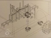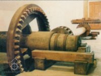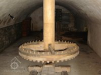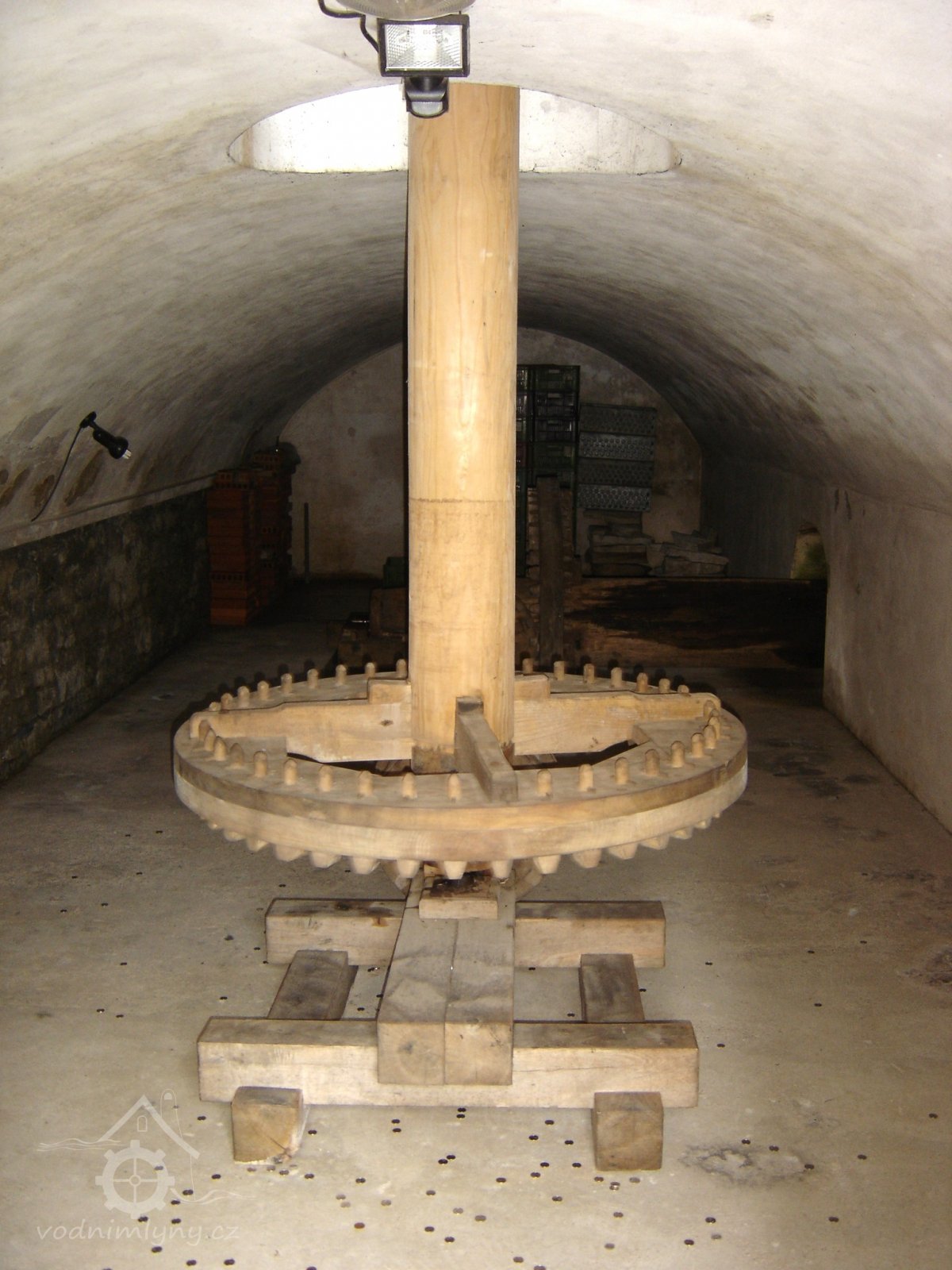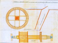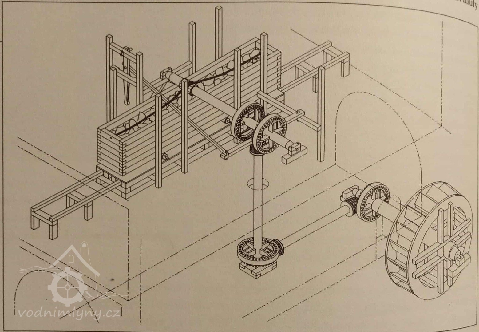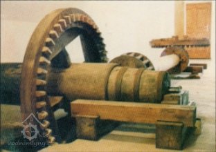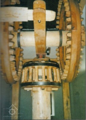 se dřevěnými palci, železného hřídele s pastorkem a 2 železnými lůžky, prázdným (volnoběžná řemenice) a hnaným kotoučem.“